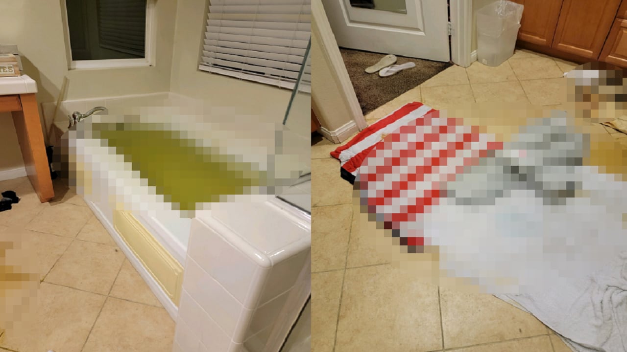 The photos show the tub filled with green water and what appears to be feces on the floor.