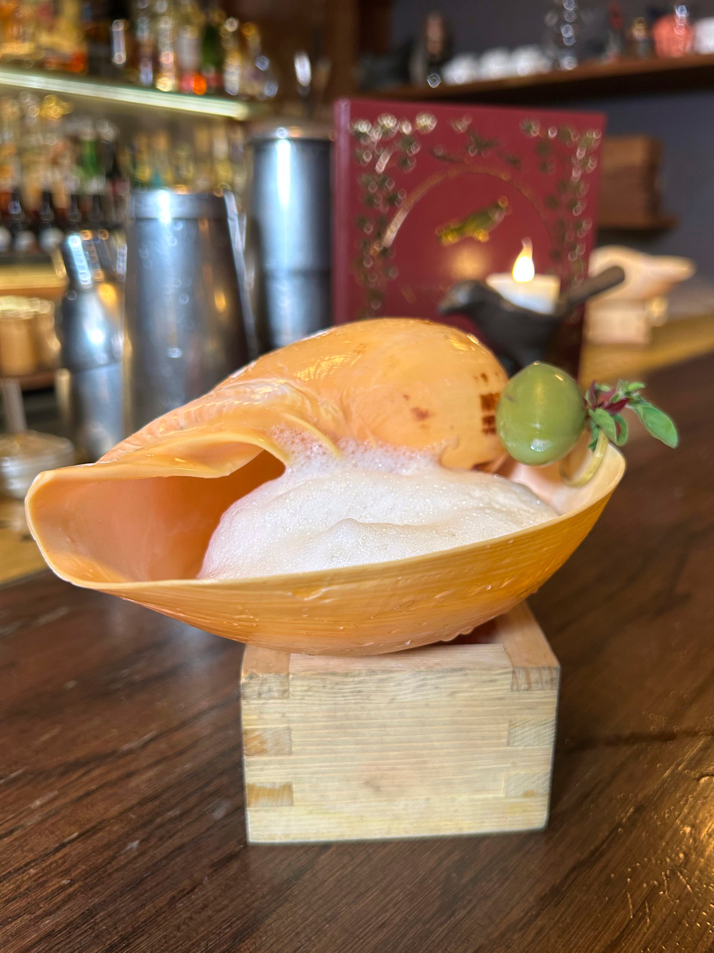 Across the globe, Nightjar has the elaborately presented “Beyond the Sea” cocktail, served in a giant shell. It's loosely inspired by the Salty Dog (gin or vodka and grapefruit juice with a salty rim), with a combination of gin, fino sherry with kombu seaweed, shiso leaves, limoncello, absinthe and grapefruit, finished off with a briny foam to evoke sea spray, and an olive.