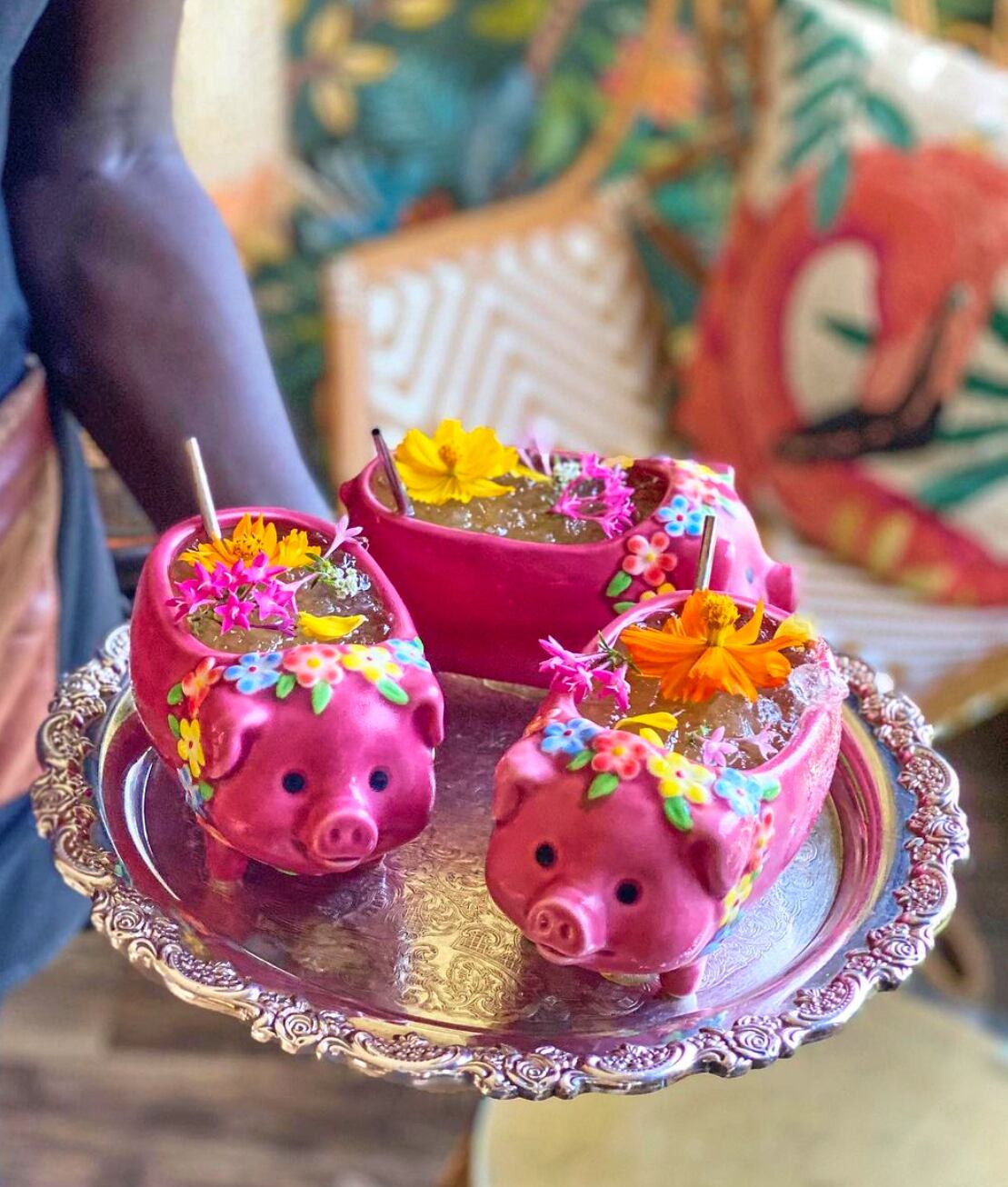 If you order the Mama Maggie, a fruity mix of coconut rum, passion fruit liqueur, hibiscus, mango lime and orange juice will be delivered to you in a photogenic porcelain pig topped with colorful fresh flowers.