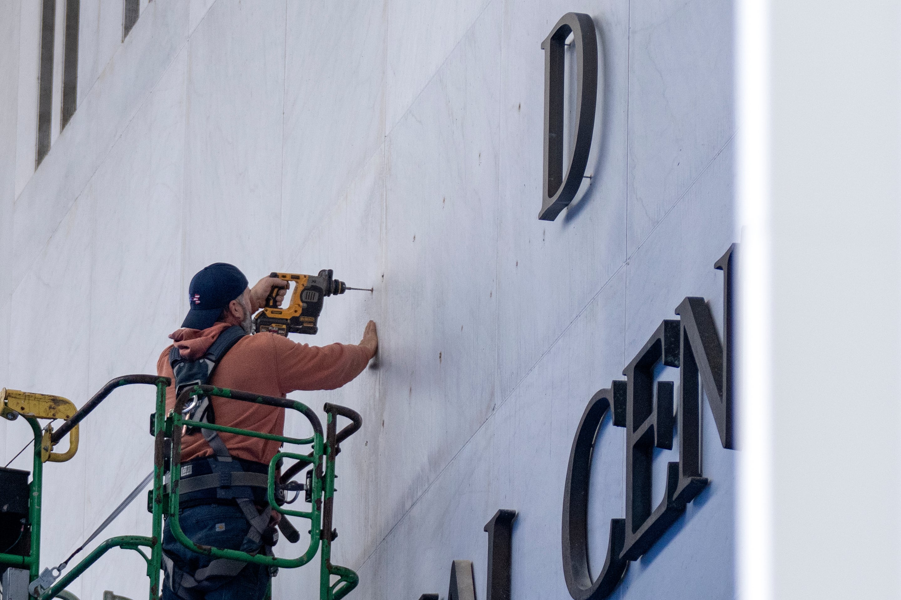 Trump Kennedy Center A worker drills holes near letters being installed above the signage on the Kennedy Center on Friday, Dec. 19, 2025, in Washington. (AP Photo/Mark Schiefelbein) (Copyright 2025 Associated Press. All rights reserved) (Mark Schiefelbein/AP)
