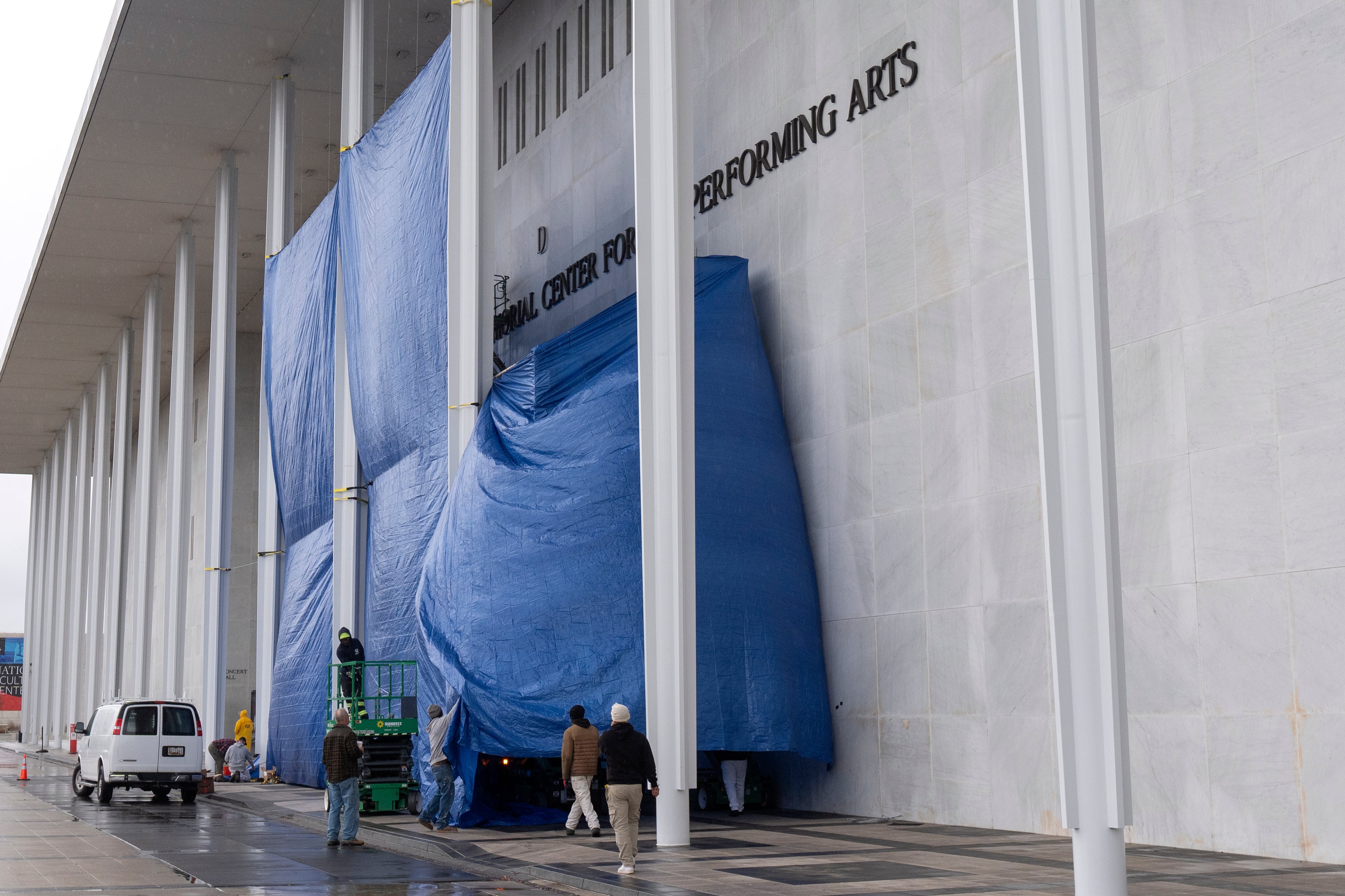 Several blue tarps were hung in front of the institution early Friday to block views of the work underway. A large letter D was seen on the exterior before the final tarps went up, along with workers on scaffolding at the center, which was named for John F. Kennedy, a Democratic president.