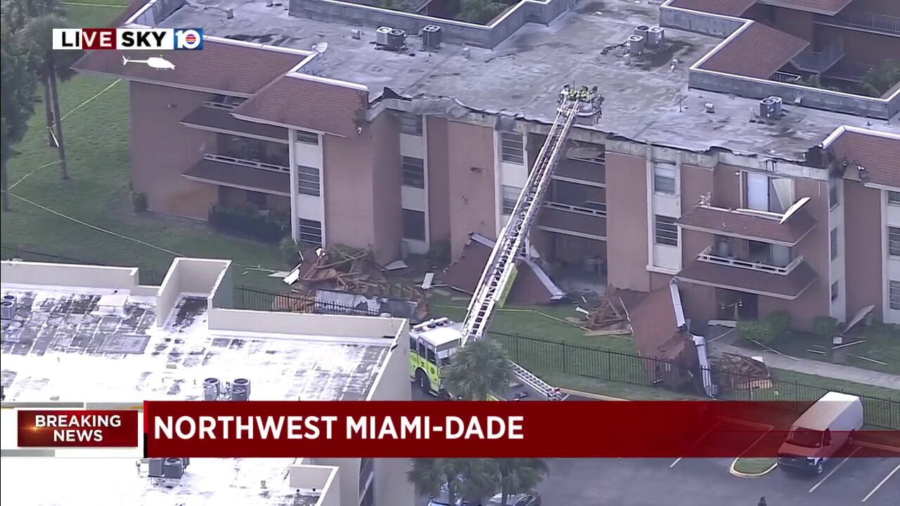 NORTHWEST MIAMI-DADE, Fla. — La policía y los bomberos permanecen en el lugar de un edificio de apartamentos de tres plantas cuyo techo se derrumbó el jueves después de las 16.00 horas.