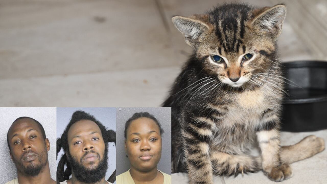 HOLLYWOOD, Fla. — Tres personas han sido arrestadas después de que la policía de Hollywood diga que un gatito recibió un disparo con una pistola de perdigones, paralándolo de las caderas hacia abajo.
