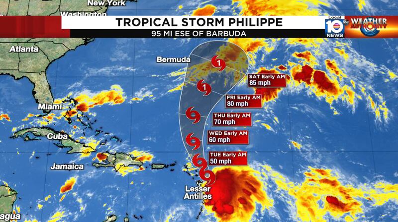 Philippe es una tormenta muy cortada, con la mayoría de sus vientos y clima al sur y al este del centro. Esta es una buena noticia para las islas que permanecerán justo al oeste en las próximas horas. Dicho esto, el clima templado y las lluvias potencialmente fuertes podrían crear problemas de inundaciones en algunas partes del norte de las Islas de Sotavento hasta el martes, ya que la larga y tormentosa cola de Philippe sigue su centro.