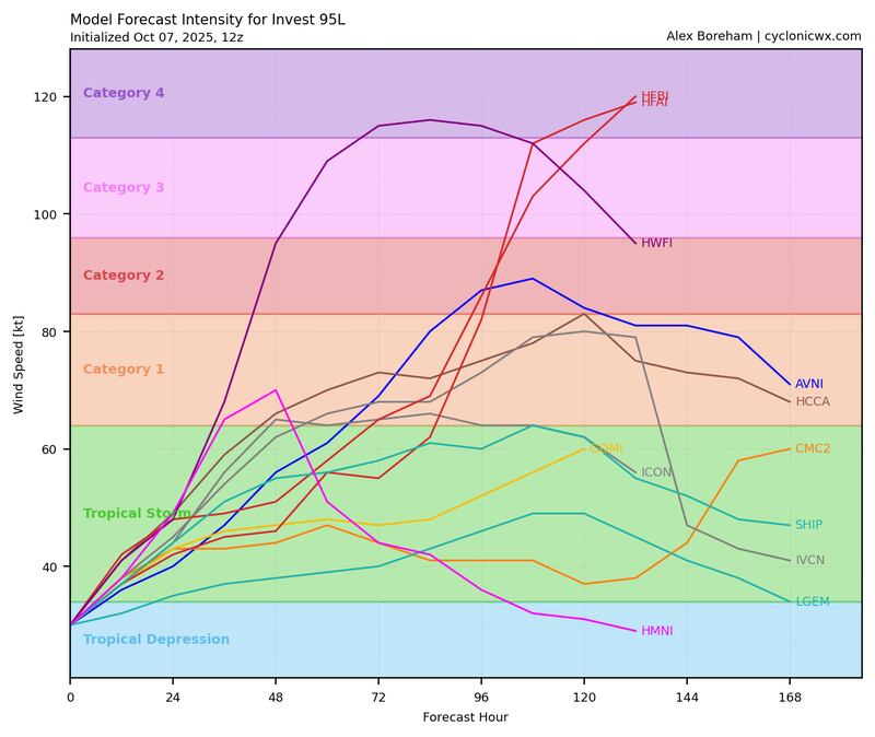El pronóstico de intensidad es complejo y la guía continúa ofreciendo amplias posibilidades, desde tormenta tropical hasta huracán mayor (categoría 3 o superior) en los próximos días.