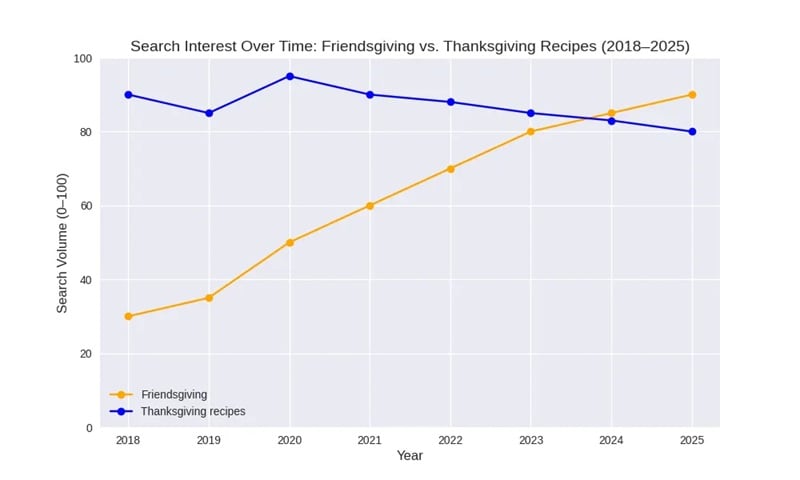 Meanwhile, a line chart tracking “Friendsgiving” vs. “Thanksgiving recipes” from 2018 to 2025 shows a steady rise in the former, reflecting a generational shift toward community-driven celebrations.