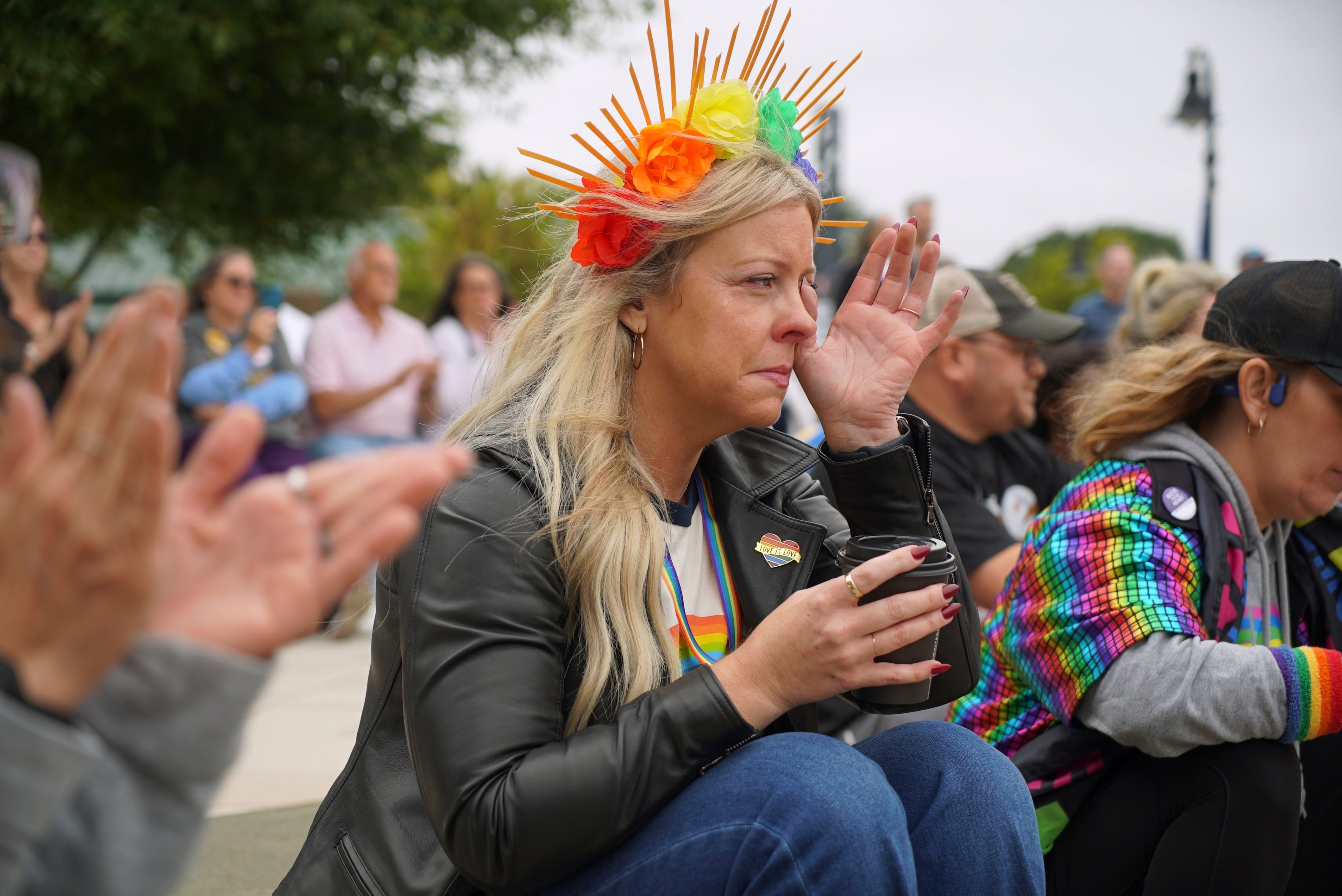 “We are going through it right now, but we’re going through it together,” Pavlovitz said as he paced the plaza in brightly-colored sneakers. “We will not allow ourselves or the people we care about to be dehumanized or mistreated or erased. We will not stand for it.”
