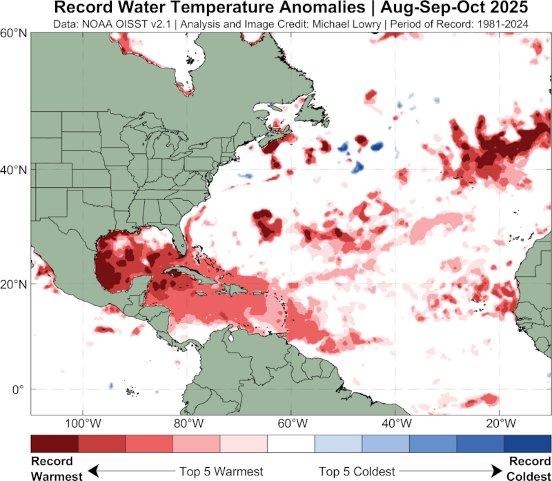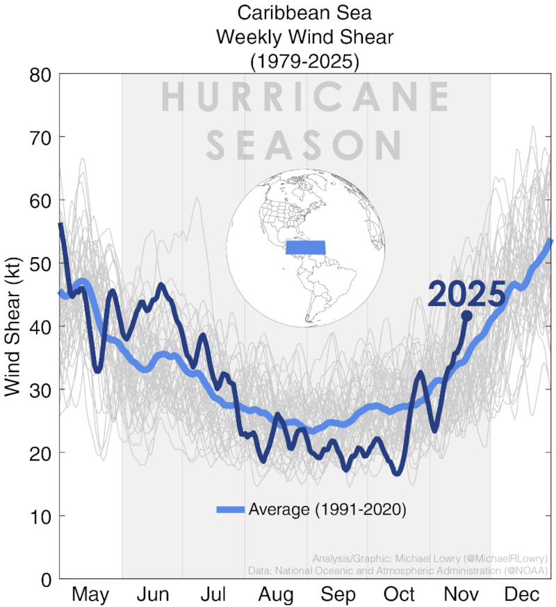 Storm-busting wind shear through the Caribbean was the lowest on record and water temperatures were near-record warm for the peak months of the season.