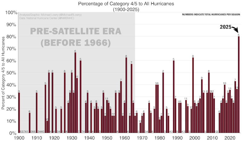With three Category 5 hurricanes, 2025 was only the second season on record to record more than two Category 5 hurricanes in a single season (2005 holds the record with four Category 5 hurricanes).