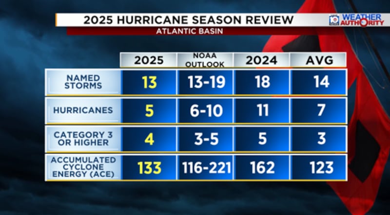 In total, the 2025 hurricane season churned out 13 named storms and 5 hurricanes – near the long-term historical average – but the hurricanes that formed were especially strong and long-lived, pushing the seasonal scorecard, as measured by the Accumulated Cyclone Energy or ACE, to above-average levels.