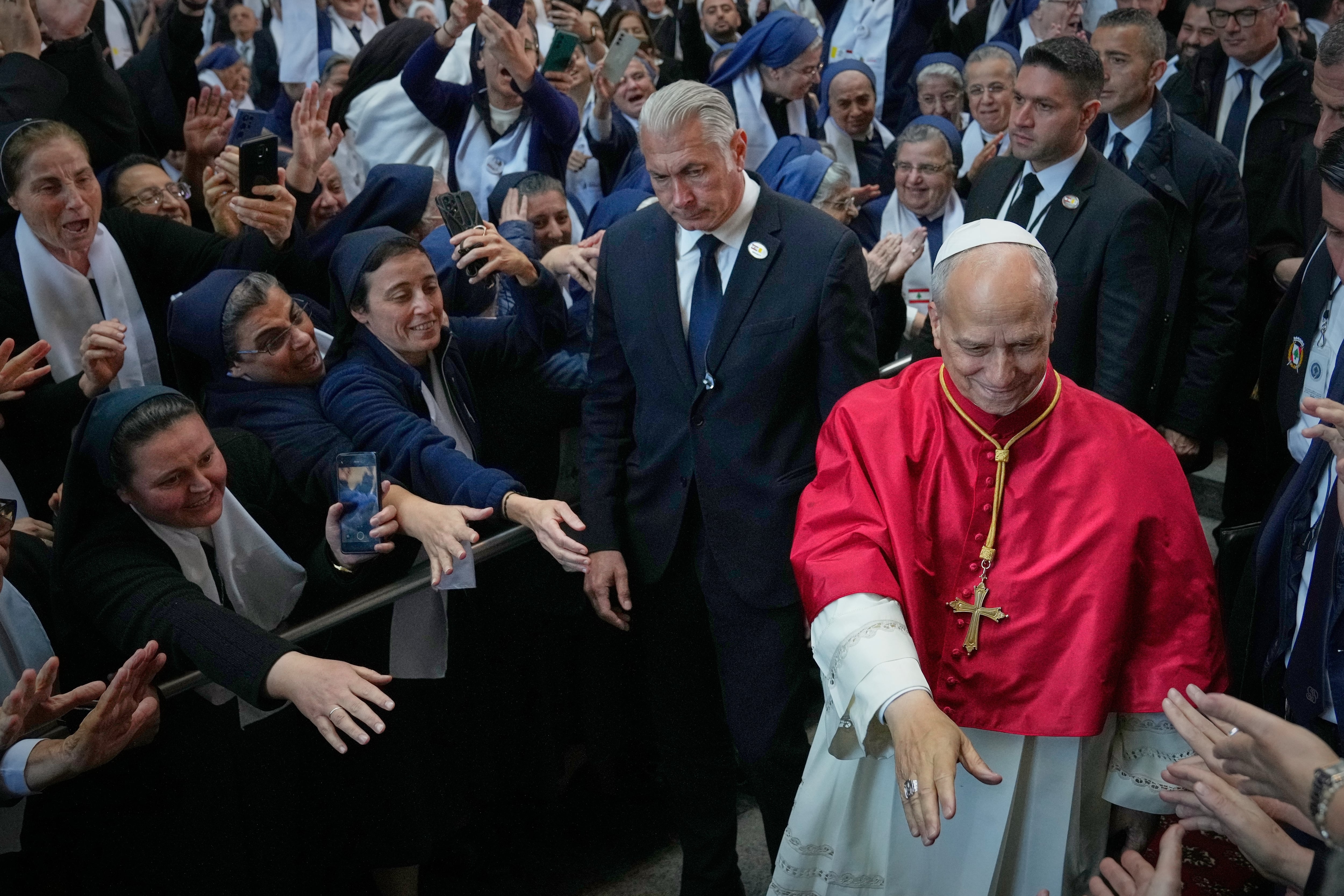Pope Leo XIV received a raucous, cheering welcome from priests and nuns at the seat of the Maronite church in Lebanon.