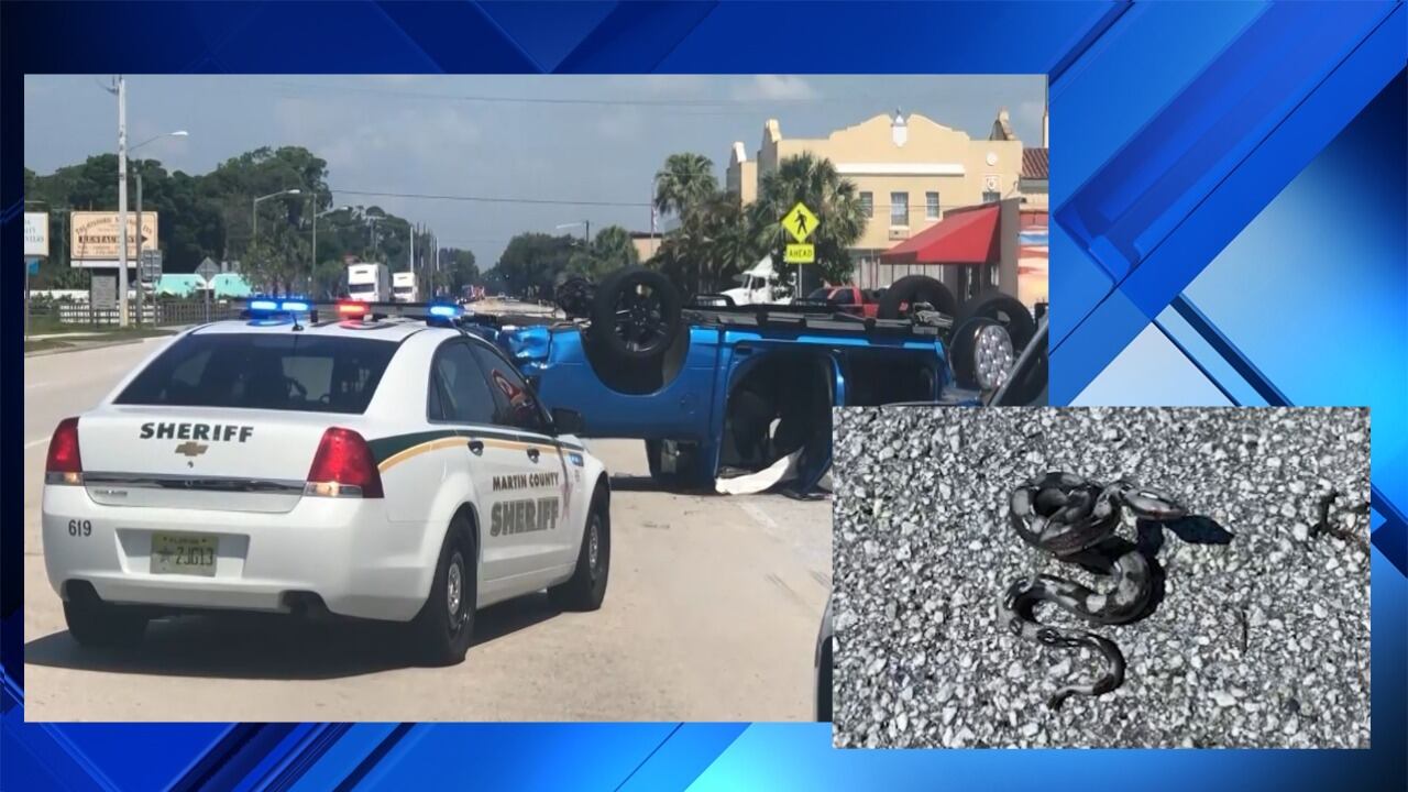 MARTIN COUNTY, Fla. — Martin County Sheriff’s deputies had their hands full on Wednesday morning. It began with a high-speed chase that ended in a multiple vehicle crash with injuries, then the driver got out of her vehicle and threw a rubber snake at deputies.