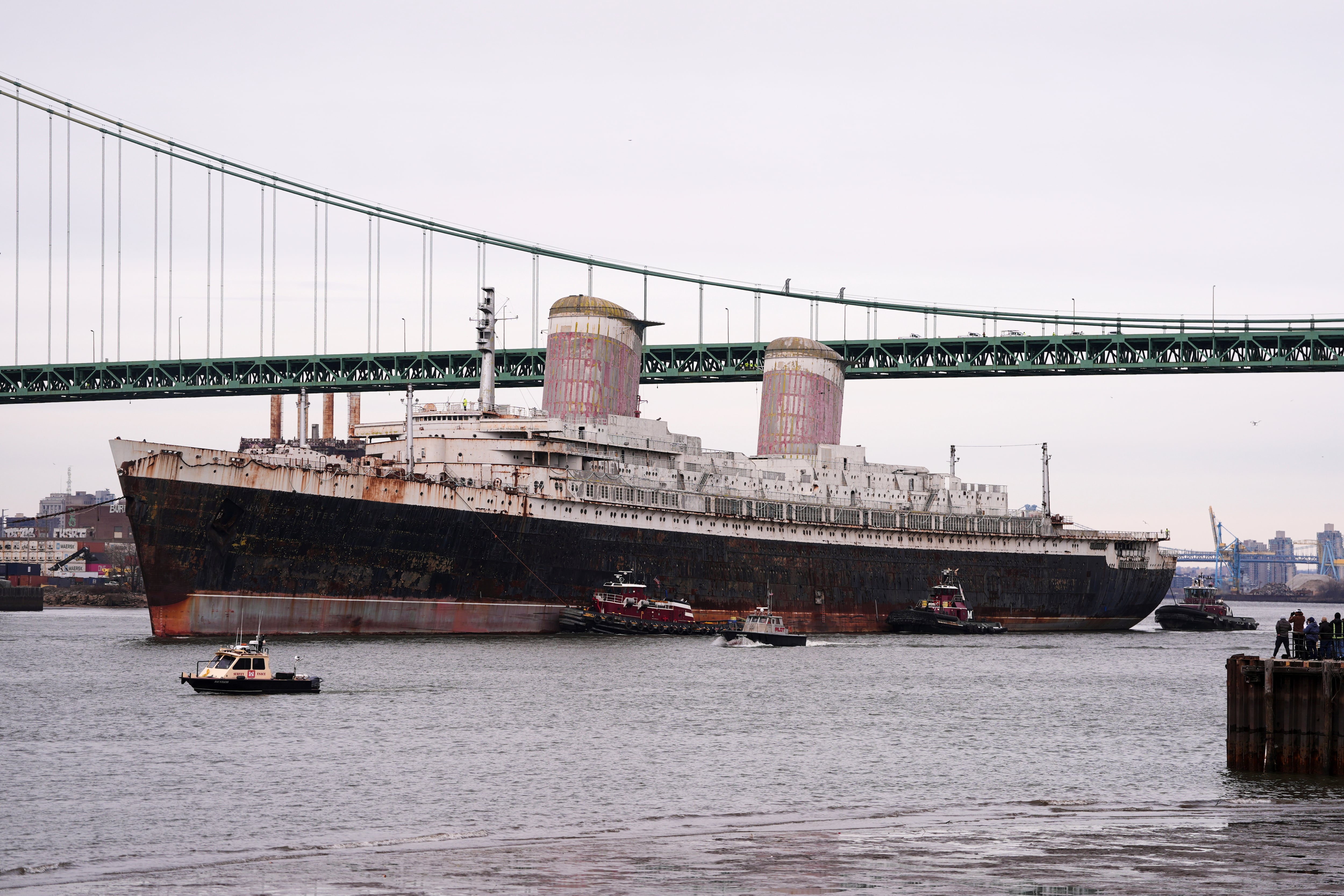 The nearly 1,000-foot (305-meter) vessel, which shattered the trans-Atlantic speed record on its maiden voyage in 1952, has spent most of this year at the Port of Mobile in Alabama, being scoured to remove chemicals, wiring, plastic and glass.