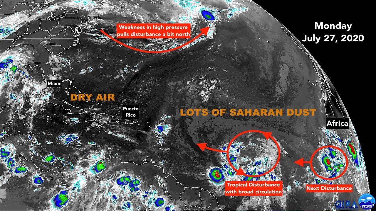 The large tropical disturbance midway between Africa and the Caribbean islands has a broad circulation. It’s trying to become the next tropical depression, and perhaps Tropical Storm Isaias.