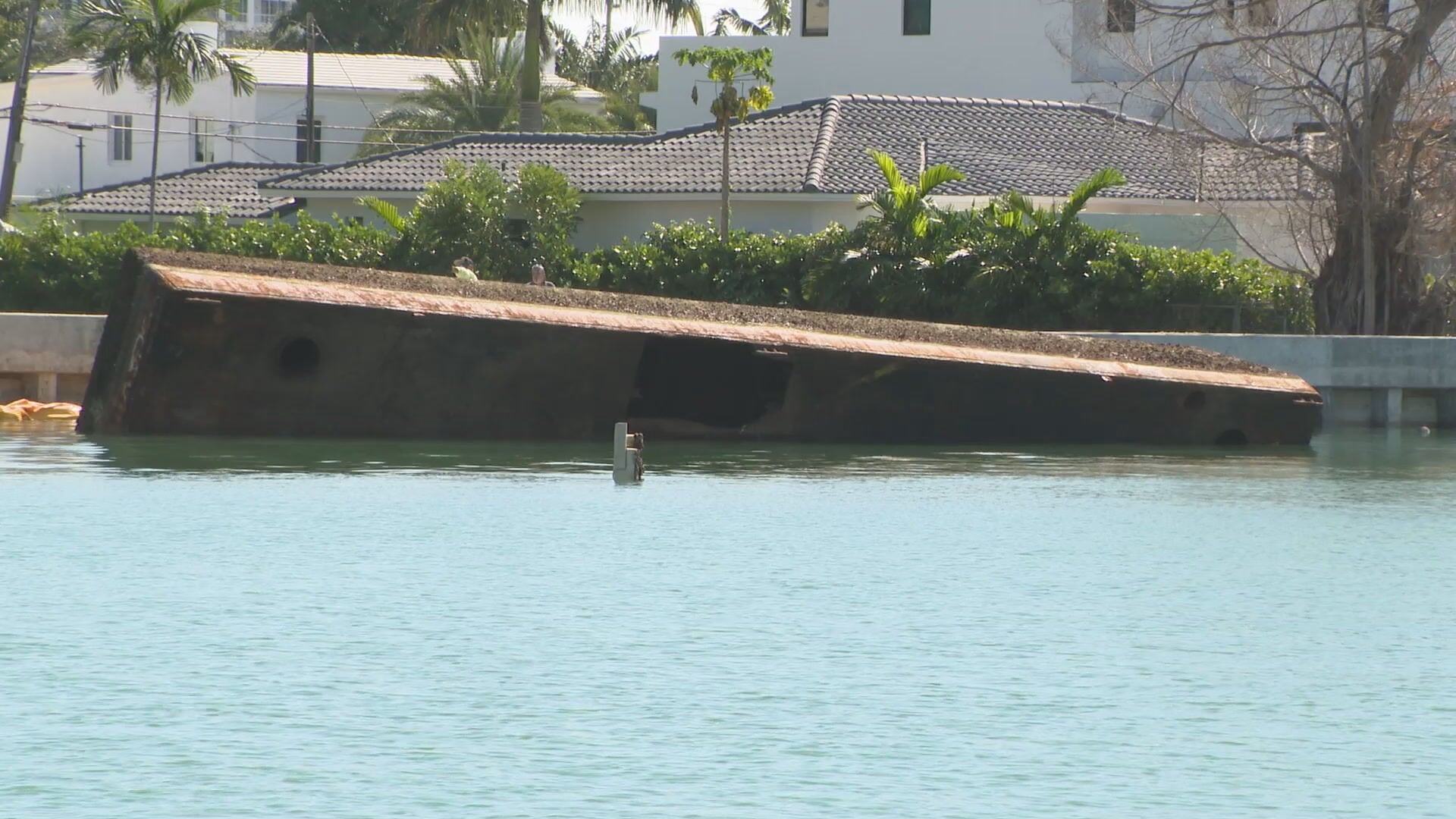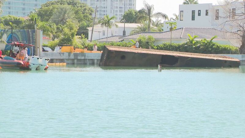 SURFSIDE, Fla. — A crane barge capsized and partially sank into the bay overnight in Surfside, hours before the town’s Paddletopia event.