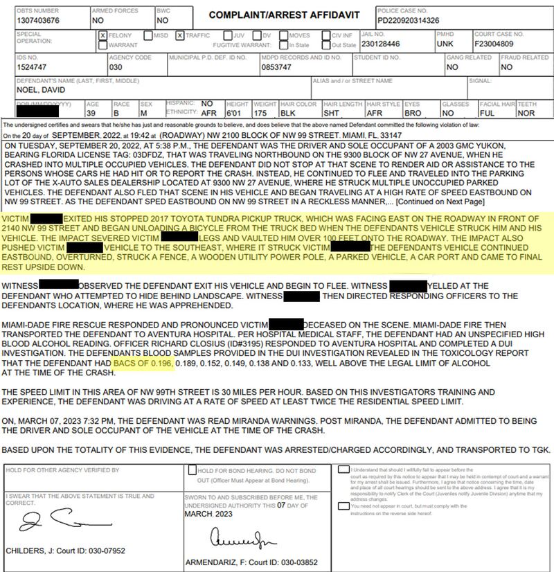 Noel then drove into X-Auto Sales at 9300 NW 27 Ave, crashed into several parked cars, didn’t stop, and started to speed eastbound on Northwest 99 Street, according to police.