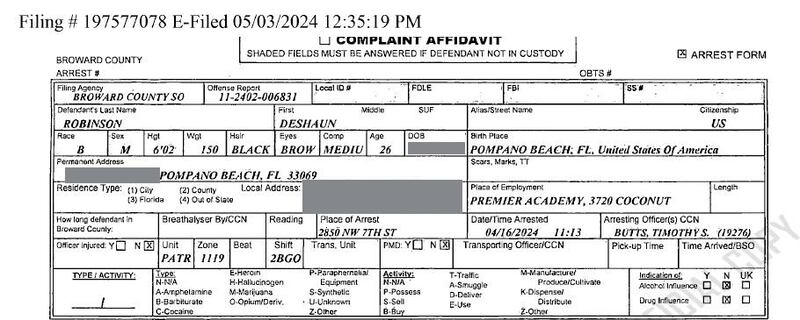 Broward prosecutors filed the new felony case against Robinson on May 3. Broward County Circuit Judge George Odom Jr. signed an arrest warrant. Deputies served it on Thursday and he appeared in court Friday.