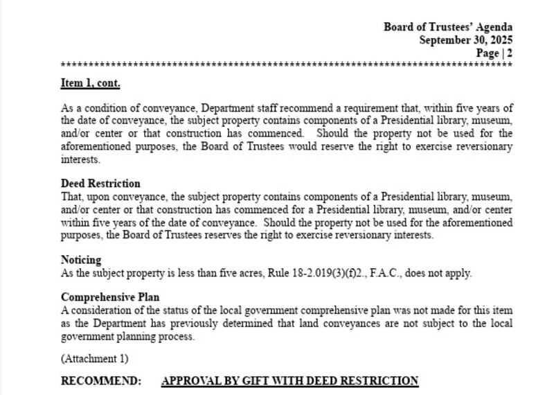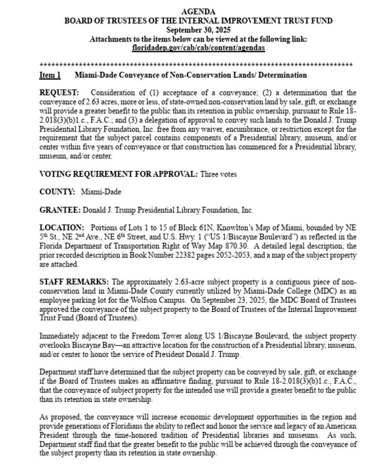 Gov. Ron DeSantis and Attorney General James Uthmeier supported a proposal that went before the Florida Board of Trustees of the Internal Improvement Trust Fund to approve the “sale, gift, or exchange” of the parcel to the Donald J. Trump Presidential Library Foundation, Inc.