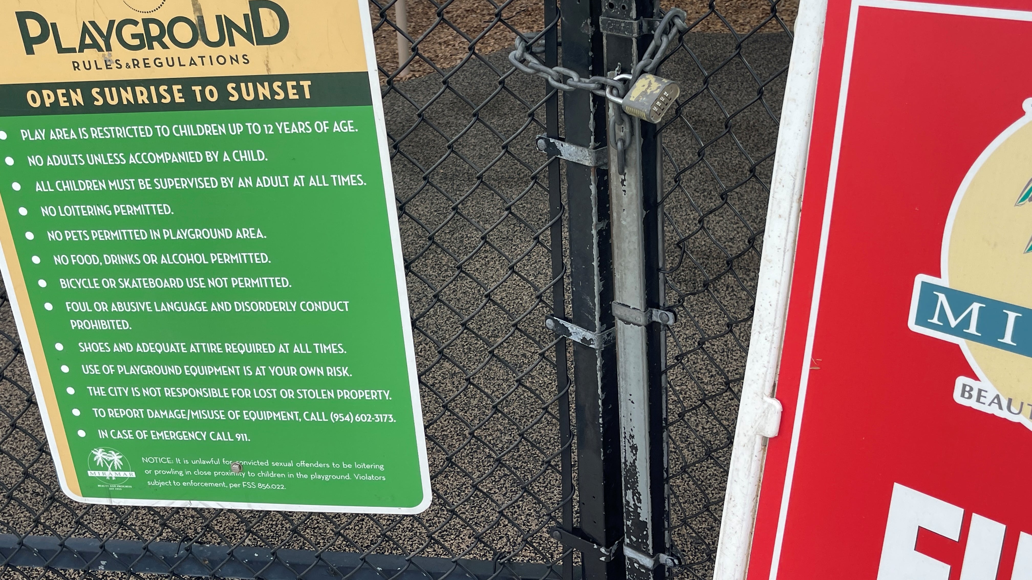 MIRAMAR, Fla. — In a sudden reversal just days after assuring the public that playgrounds at Miramar Regional Park were safe, the city has locked them up, a move that comes only after Local 10 News raised serious safety concerns.