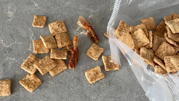 According to Los Angeles-based writer and comedian Jensen Karp, he discovered what appear to be shrimp tails tossed in cinnamon sugar, as well as dental floss, black unidentifiable objects, and more inside of a family-pack box of General Mills Cinnamon Toast Crunch cereal.