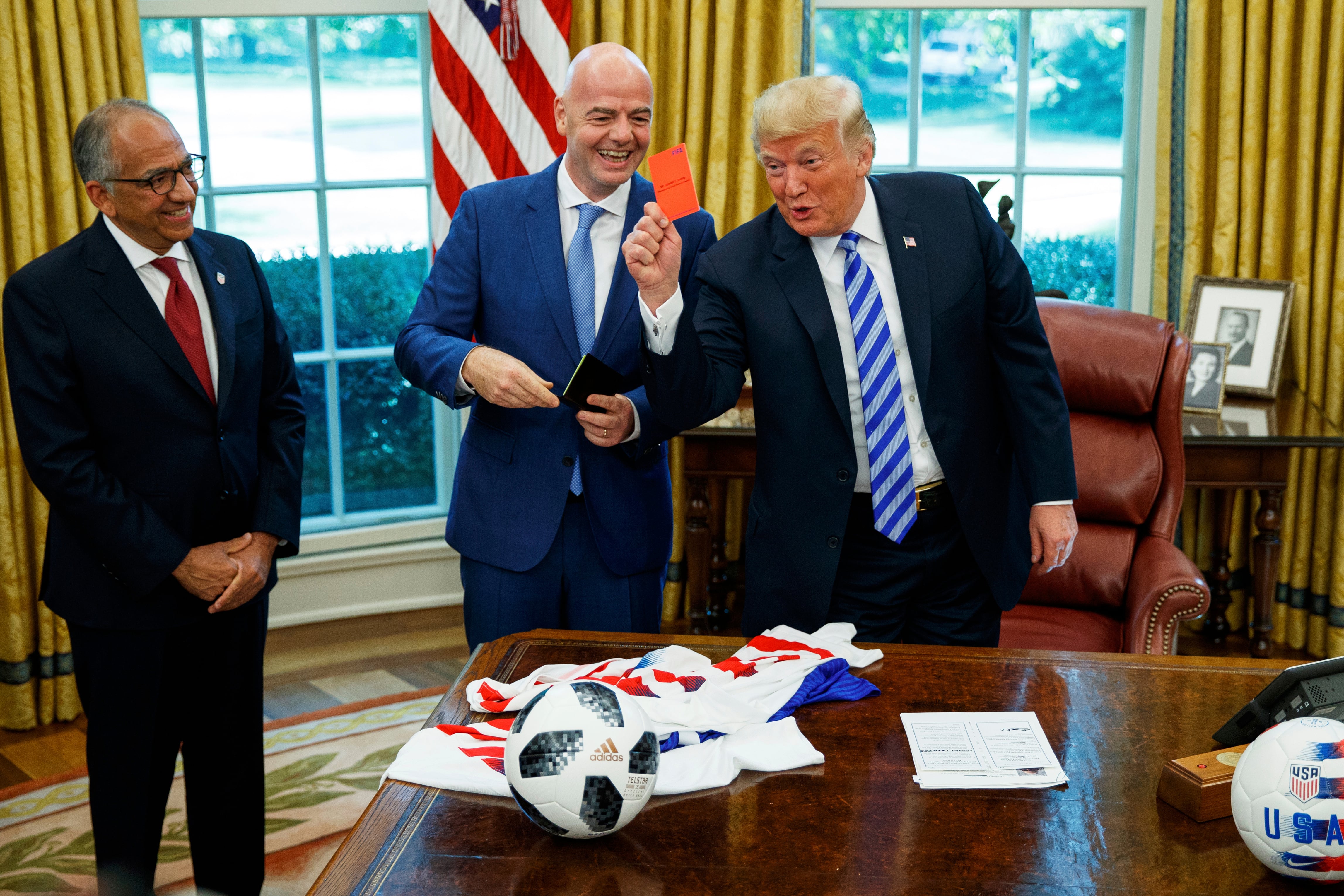Shortly after the U.S. was awarded the tournament, Trump hosted Infantino at the White House. Infantino, who was also serving his first term as FIFA president, made an impression by handing Trump red and yellow penalty cards, joking they could be used on the press.