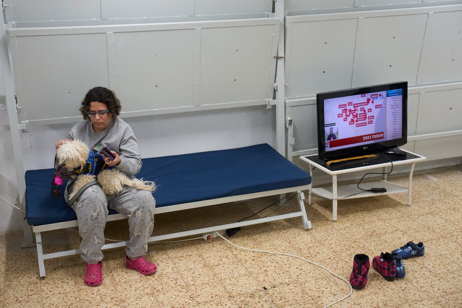 They’ve spent most of the past two weeks living with three other families in their neighborhood shelter, where steel bunk beds fold down from the walls. When her grandson’s online classes are paused because of missile alerts, he casually switches to cartoons on his iPad and curls up on an inflatable mattress.