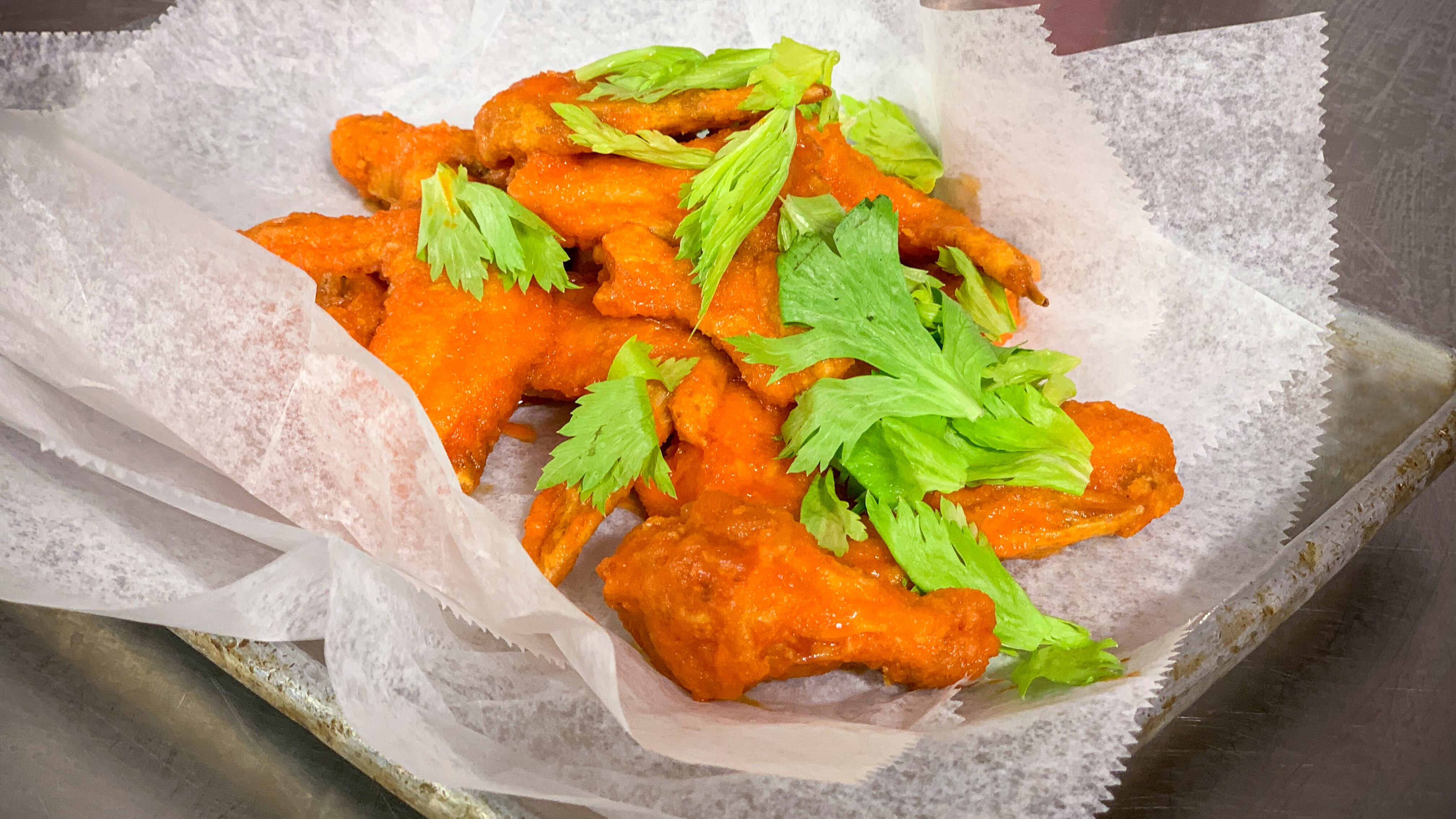 After the wings have cooked, transfer to a large bowl and toss with as much of the sauce as desired. Garnish with celery leaves. Serve with blue cheese dip and celery and carrot sticks.