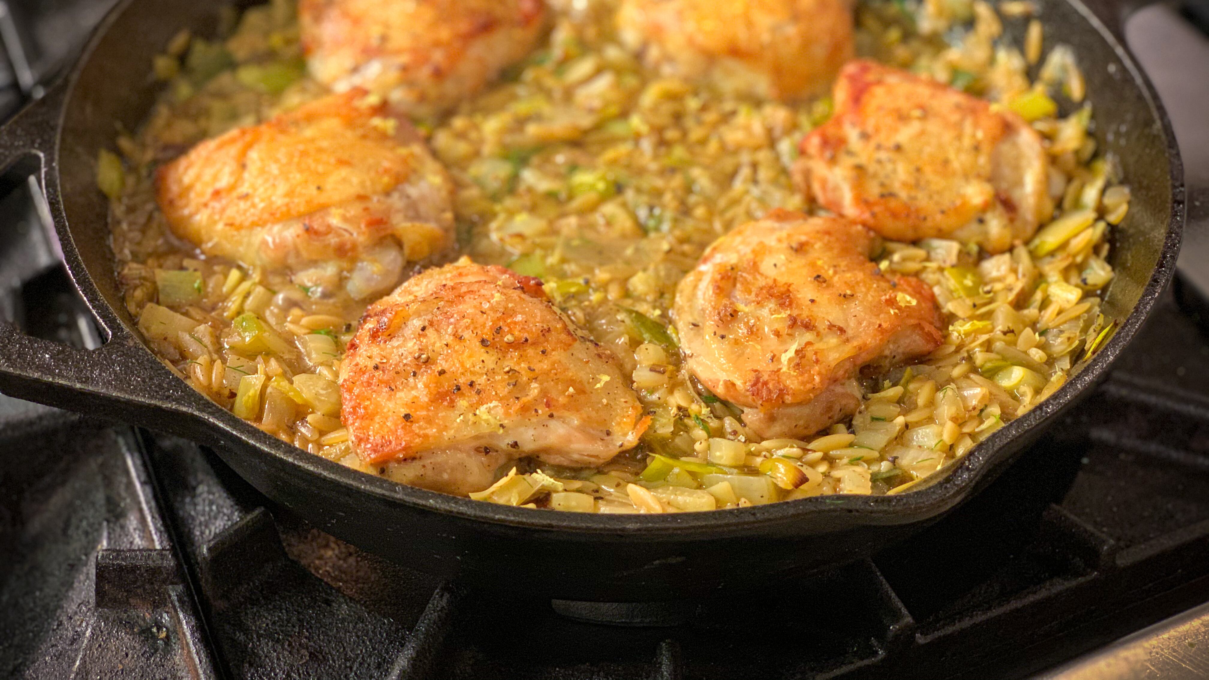 Remove all but ½ tablespoon of fat from the skillet. Set over medium heat; combine fennel bulb and leek in skillet and sprinkle in some salt and pepper. Cook, stirring occasionally, until leek is looking golden around the edges, about 5 minutes. Add orzo and cook until pasta is darkened (it will take on a brown hue) to a nice nutty brown in spots and toasty smelling, about 3 minutes. Pour in wine and cook, stirring, until liquid is evaporated, about 1 minute. Add broth ½ cup at a time, stirring constantly and letting broth absorb before adding more, until orzo is tender and broth is mostly absorbed but pan is not dry, 10–15 minutes.
