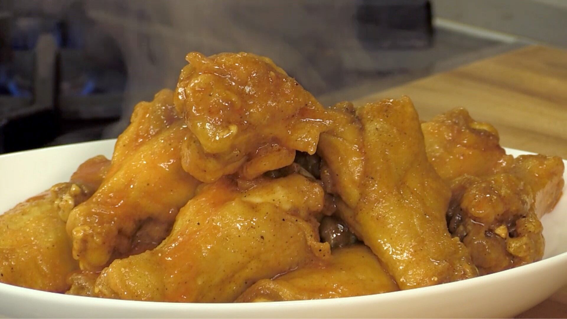Mix together the wings with spices and cornstarch. Fry in 350°F-360°F oil until golden brown and cooked through, about 10-12 minutes. Toss into the wing sauce and serve with your favorite dipping dressing.