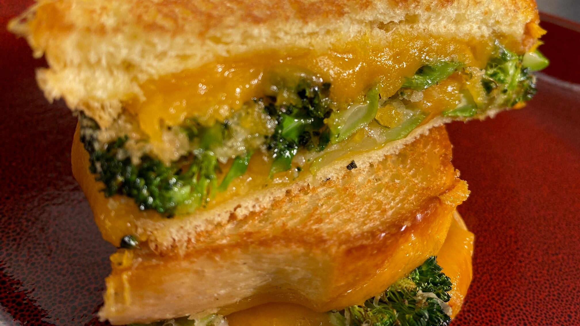 To build the grilledcheese, use a cast iron or heavy-bottomed oven-safe skillet. You can use an oven-safe nonstick pan, ifdesired. If you aren’t using a nonstick pan, you can use a little cooking sprayto lightly coat your pan. Heat your panover medium heat and add a pat or two of butter, let it melt. Shingle the cheese on one side of the bread,close your sandwich and cook for 2-3 minutes until golden brown on one side. Flip over to the other side and place in theoven. Cook for 3-4 minutes until thecheese is melted and bubbling and the bottom side of the bread is golden brown. Remove from the oven, open carefully andadd as much of the roasted broccoli as you like, close and enjoy.