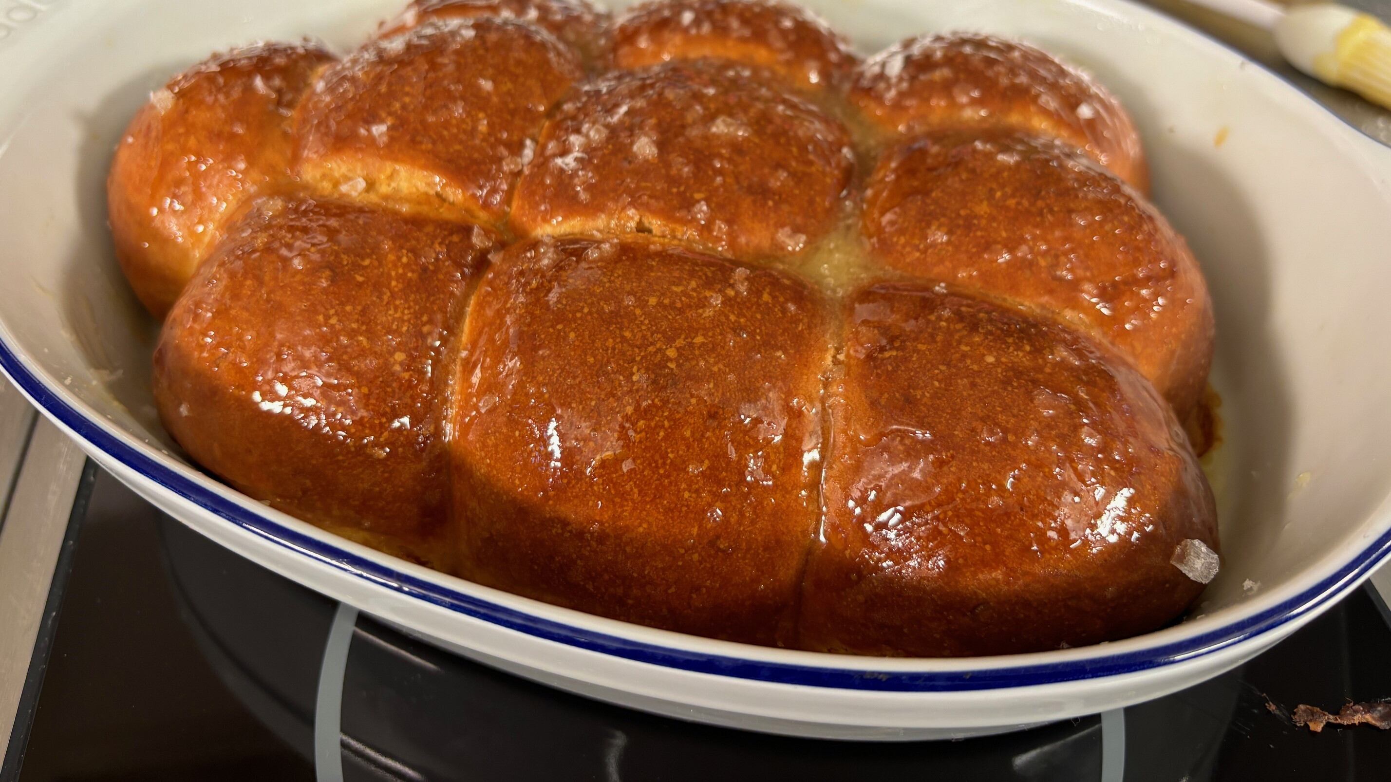 Make the salted honey topping. In a small saucepan over medium heat, melt the butter for the topping. Whisk in the honey for the topping to combine. Use a pastry brush to brush the top of each roll with the salted honey topping immediately after pulling out the rolls from the oven. Garnish with flaky salt. Serve immediately. The rolls can be stored in an airtight container or zip-top bag at room temperature for up to 2 days.