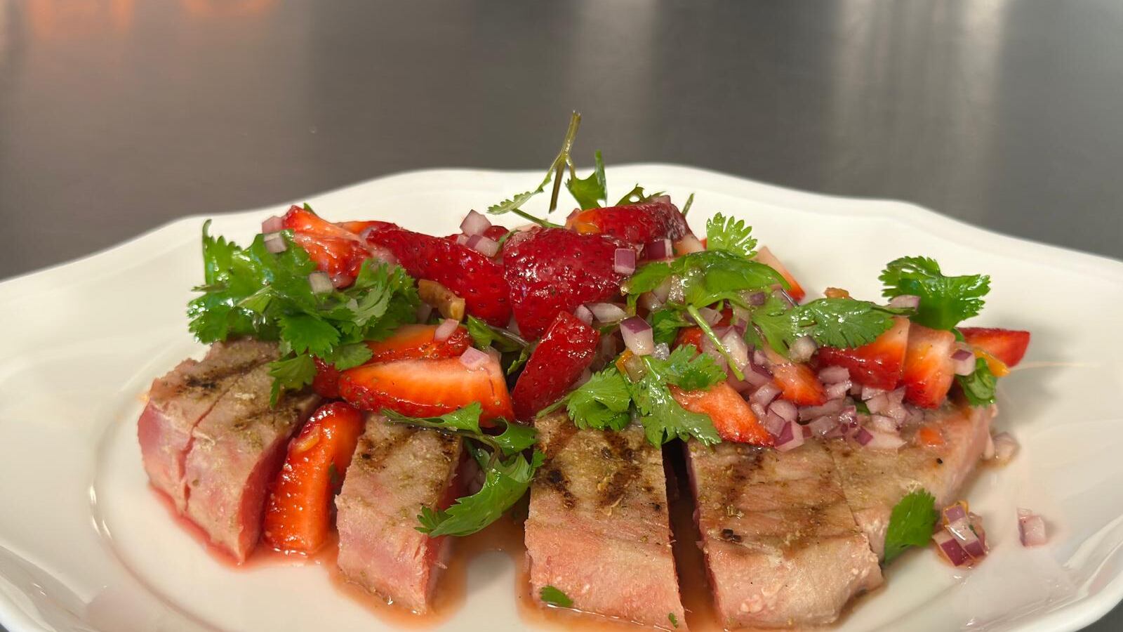 Season the fish with kosher salt, ground fennel seed and red crushed chilies to taste. If using tuna, grill or sear to medium rare. If using another fish, cook to your desired doneness before serving. Serve the fish topped with the strawberry salsa.