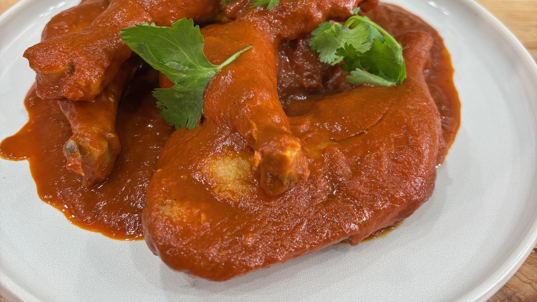 Transfer half the stewed ingredients and all chilies to a blender. Add the vinegar, spices (NOT the BAY LEAF!) and salt and puree until smooth; add the rest of the sauce and continue pureeing until smooth.