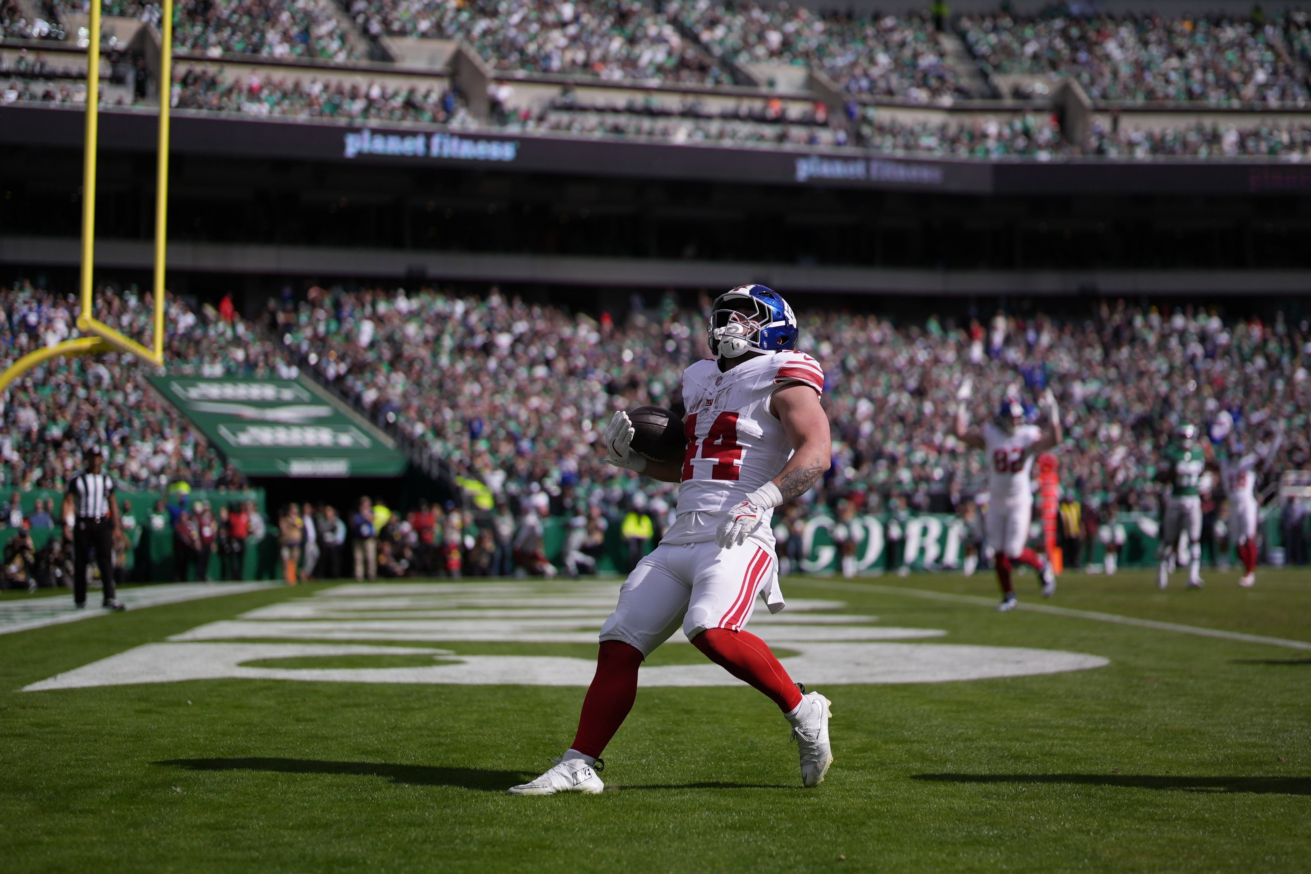 He had three rushing touchdowns against the Eagles earlier this month and had already caught an 18-yard touchdown pass from Jaxson Dart in Sunday's game.