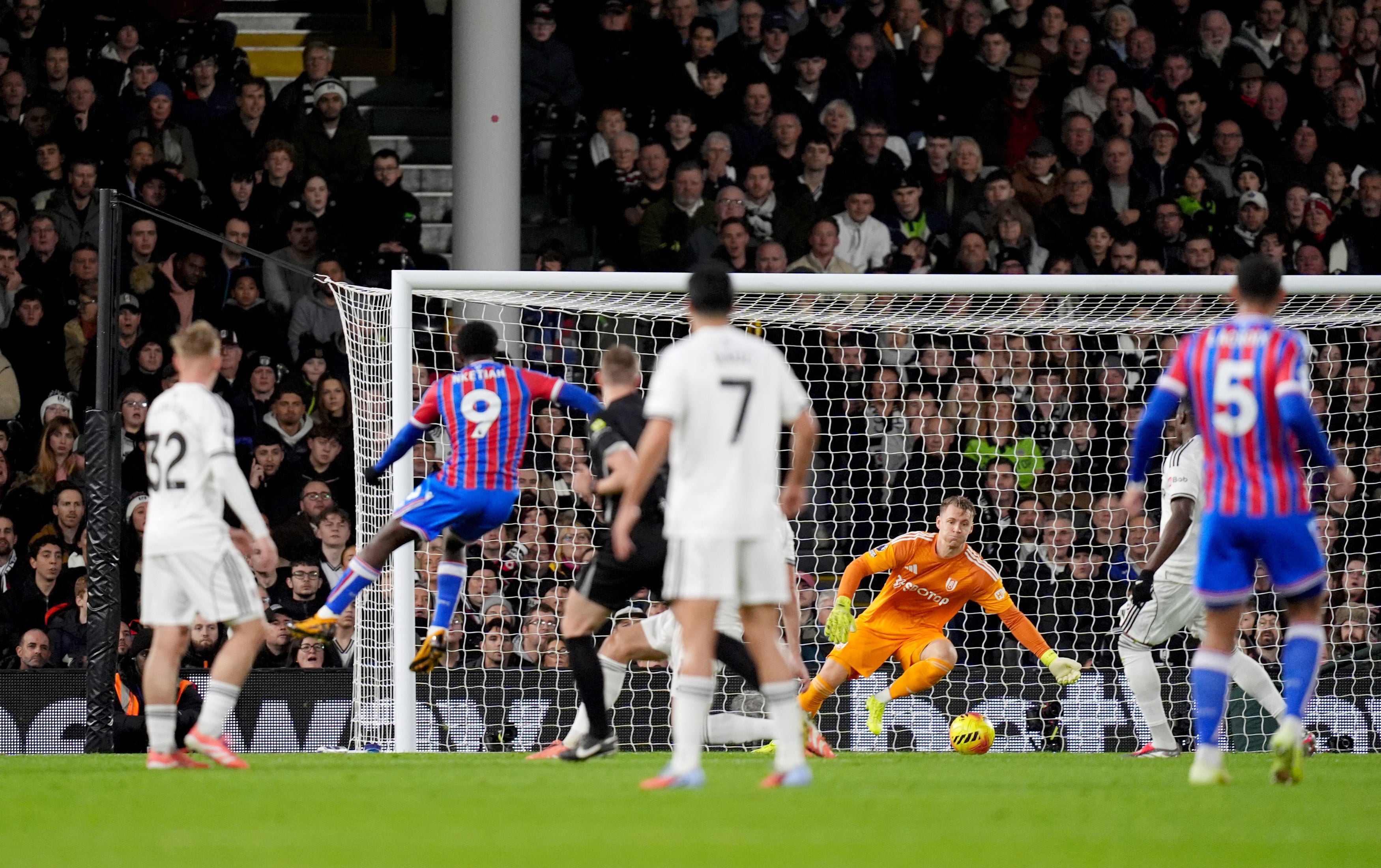 Britain Premier League Soccer Crystal Palace's Eddie Nketiah, second left, scores his sides first goal during the English Premier League soccer match between Fulham and Crystal Palace, in London, Sunday, Dec. 7, 2025. (John Walton/PA via AP) (PA Wire) (John Walton/AP)