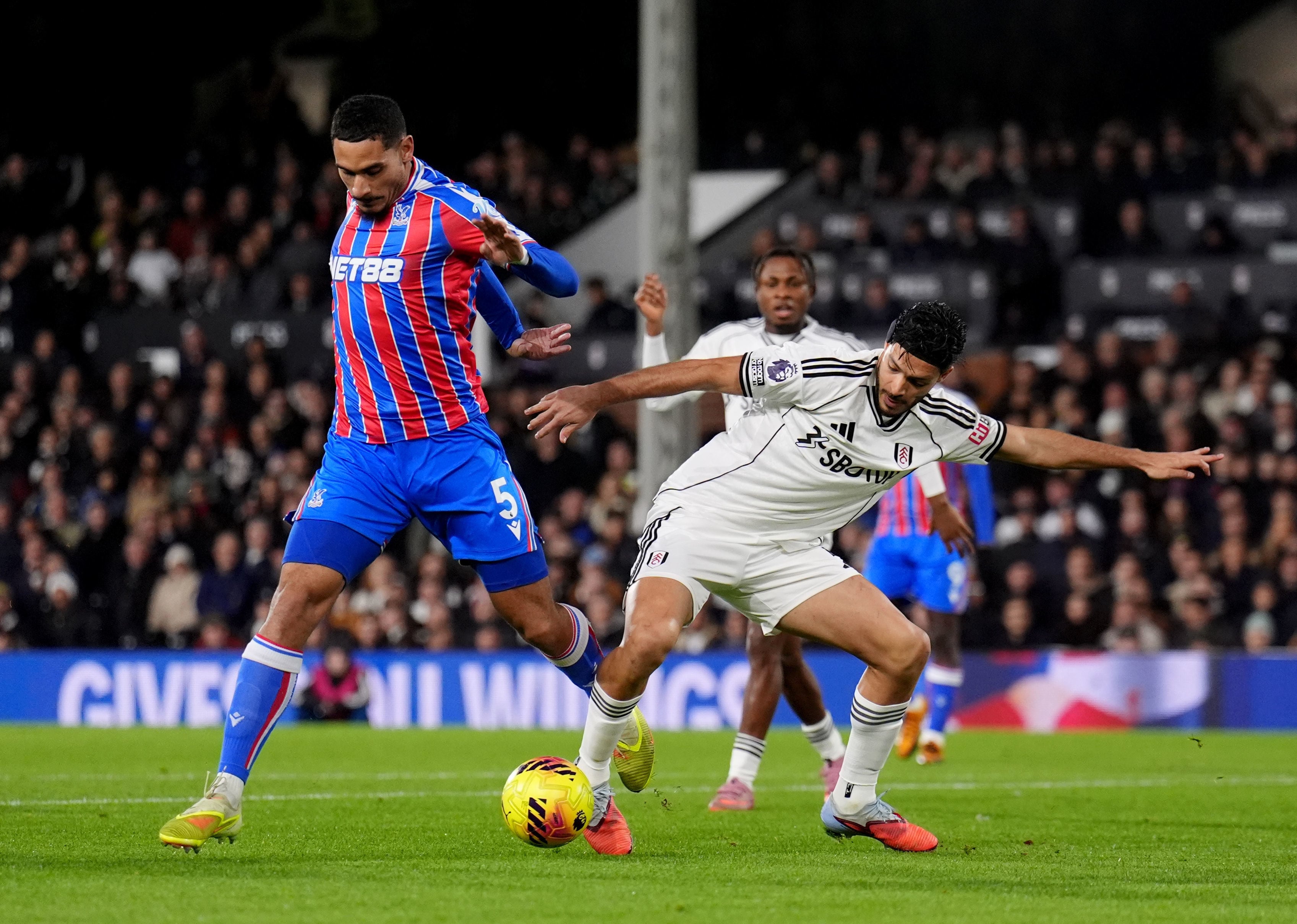 Britain Premier League Soccer Crystal Palace's Maxence Lacroix, left, and Fulham's Raul Jimenez battle for the ball during the English Premier League soccer match between Fulham and Crystal Palace, in London, Sunday, Dec. 7, 2025. (John Walton/PA via AP) (PA Wire) (John Walton/AP)