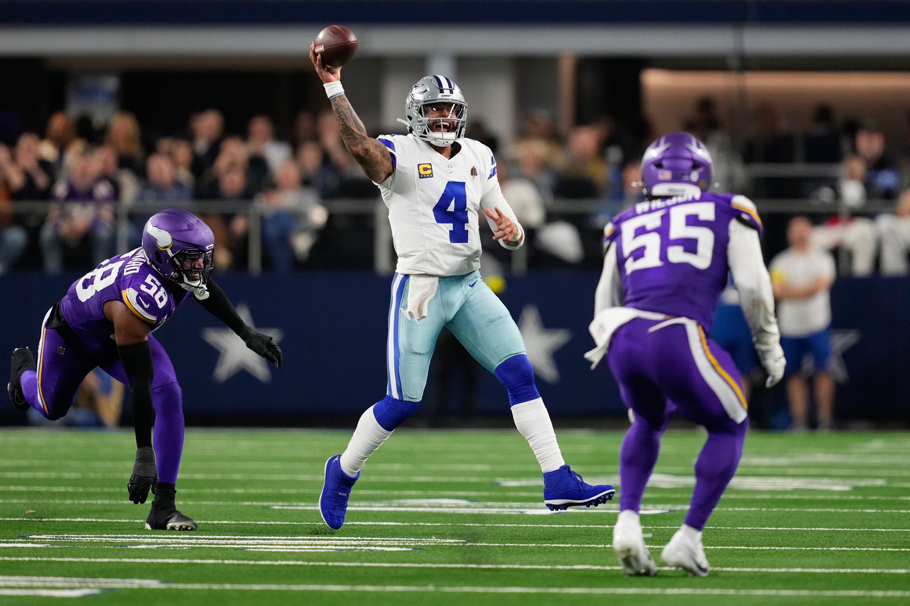 ARLINGTON, Texas (AP) — J.J. McCarthy threw for two touchdowns and ran for a score, C.J. Ham had the go-ahead TD on his first carry of the season and the Minnesota Vikings severely damaged Dallas' playoff hopes with a 34-26 victory over the Cowboys on Sunday night.