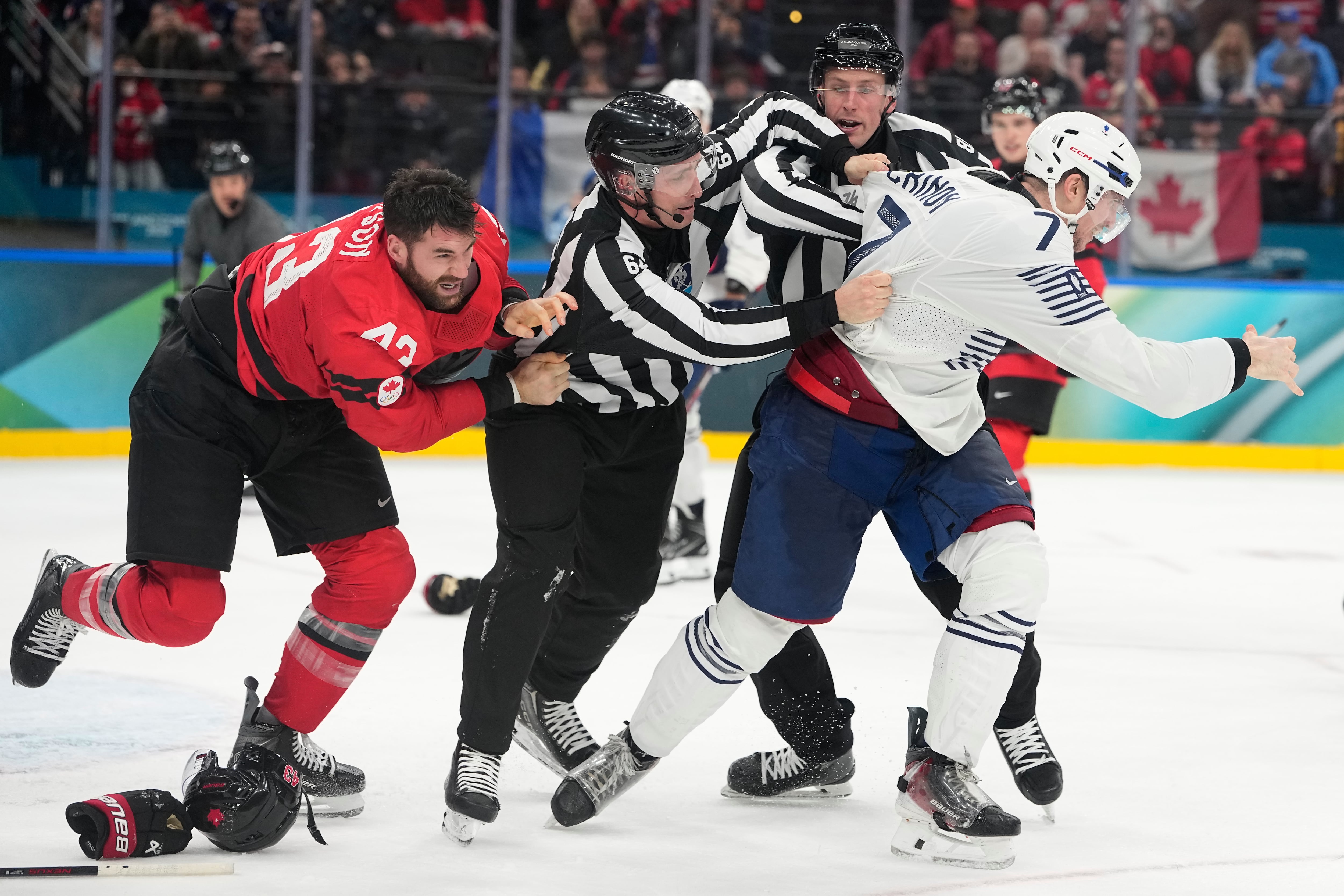 MILAN (AP) — Who says there’s no fighting in hockey at the Olympics? Tom Wilson clearly does not care that it's shunned in international play.