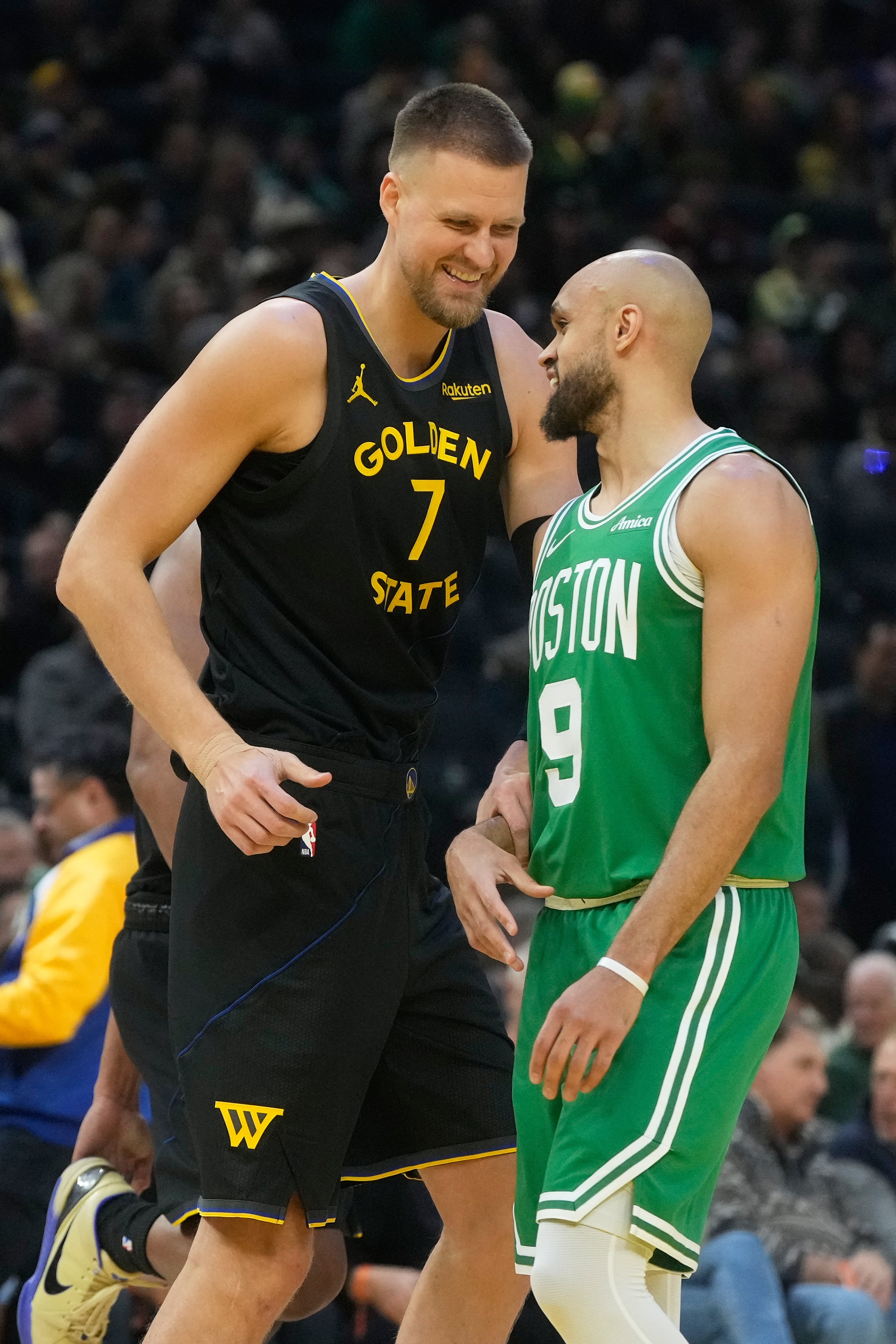 Celtics Warriors Basketball Golden State Warriors center Kristaps Porziņģis (7) talks with Boston Celtics guard Derrick White (9) during the first half of an NBA basketball game in San Francisco, Thursday, Feb. 19, 2026. (AP Photo/Jeff Chiu) (Copyright 2026 The Associated Press. All rights reserved) (Jeff Chiu/AP)
