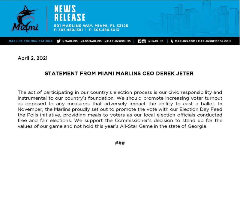 MIAMI, Fla. — Miami Marlins CEO Derek Jeter released a statement Friday supporting MLB’s decision to move the all-star game from Atlanta.