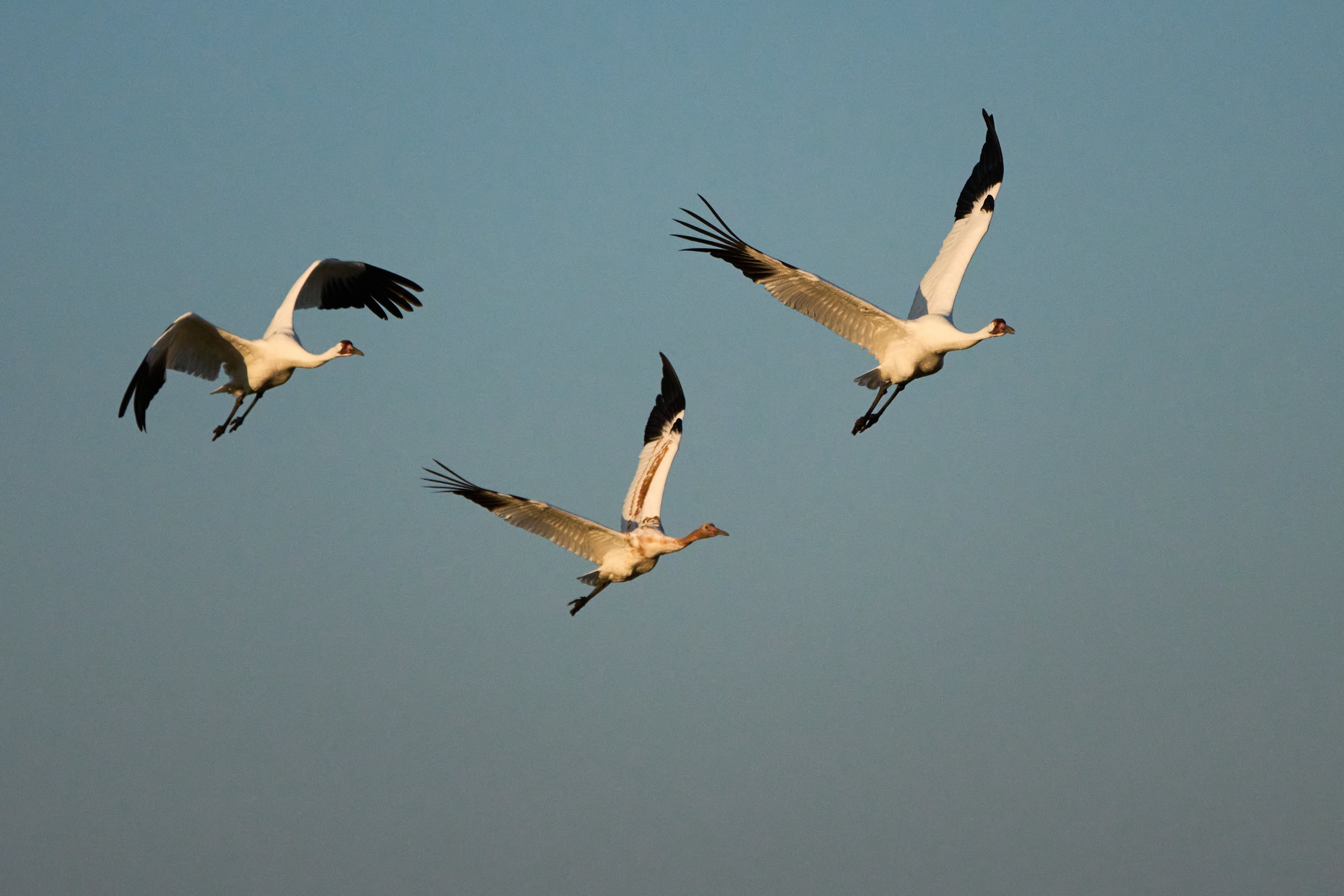 Standing at about 5 feet (1.5 meters) tall, the whooping crane is the tallest bird in North America with wingspans of up to 7.5 feet (2.3 meters) wide, so they need large landscapes to live in. They're snowy white as adults with black wing tips and a red forehead. It's one of 15 crane species in the world across Africa, Asia, Australia, Europe and North America — 10 of which are threatened with extinction.