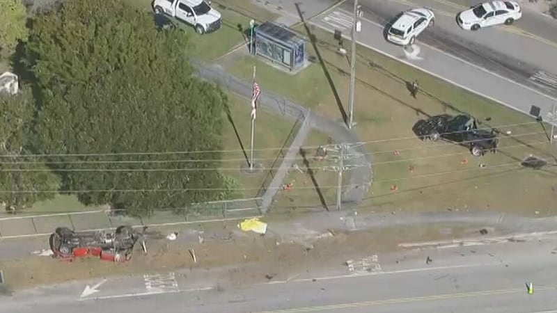 SKY 10’s aerial video shows debris from the red vehicle in a grassy area, and there was a yellow tarp on the sidewalk.