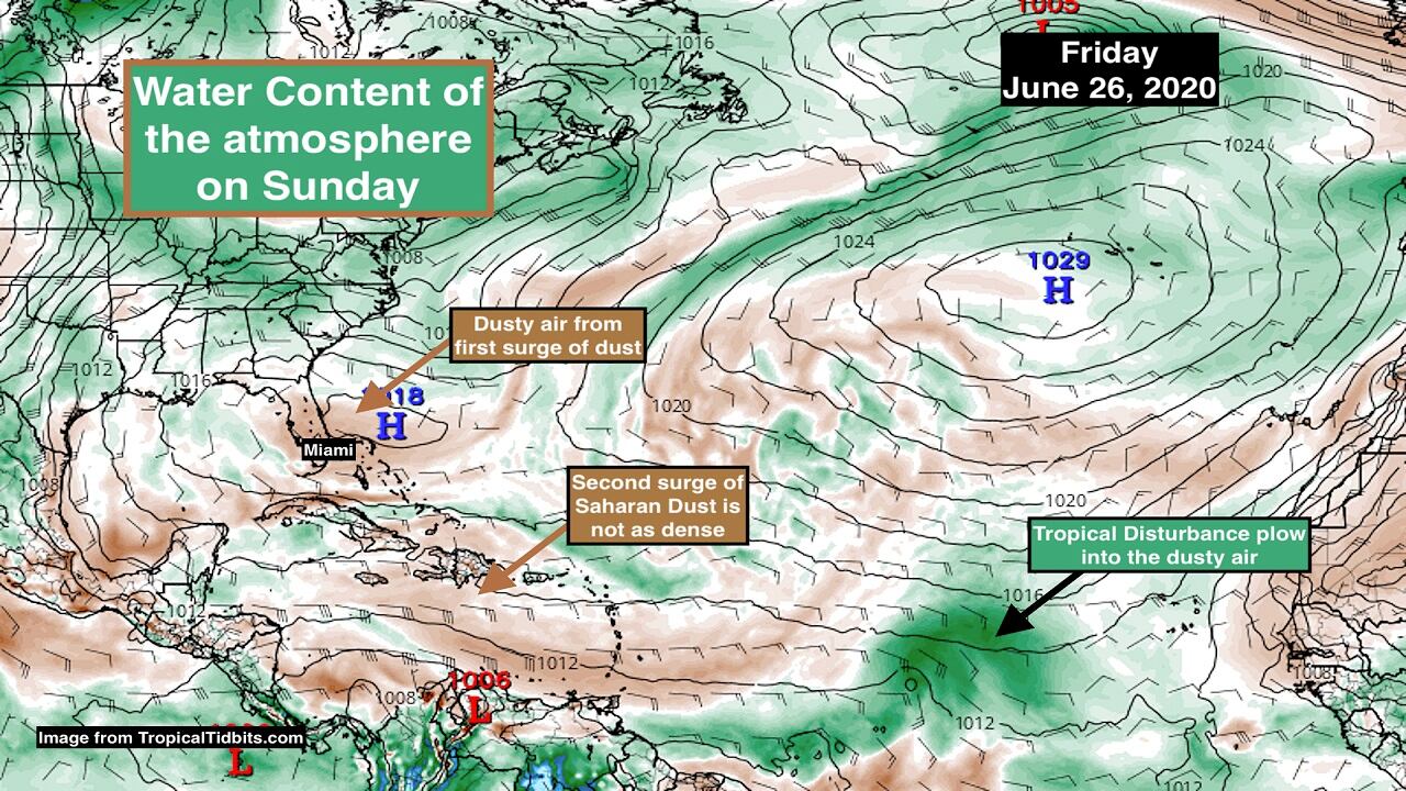 The first surge of Saharan dust that we have been tracking all week is forecast to loop around the Gulf of Mexico and move down the Florida peninsula over the weekend. We may notice it beginning Sunday and into next week.