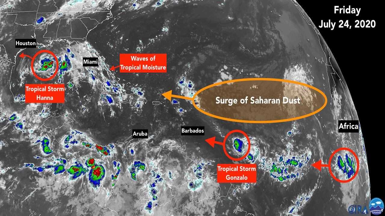 Tropical Storm Hanna is continuing to get organized as it heads toward the Texas coast. Far out in the Atlantic, Tropical Storm Gonzalo could still become a hurricane as it tracks toward the eastern Caribbean islands. And in the Pacific, fierce Hurricane Douglas is on course for the Hawaiian Islands. All three of these storms will impact land over the weekend.