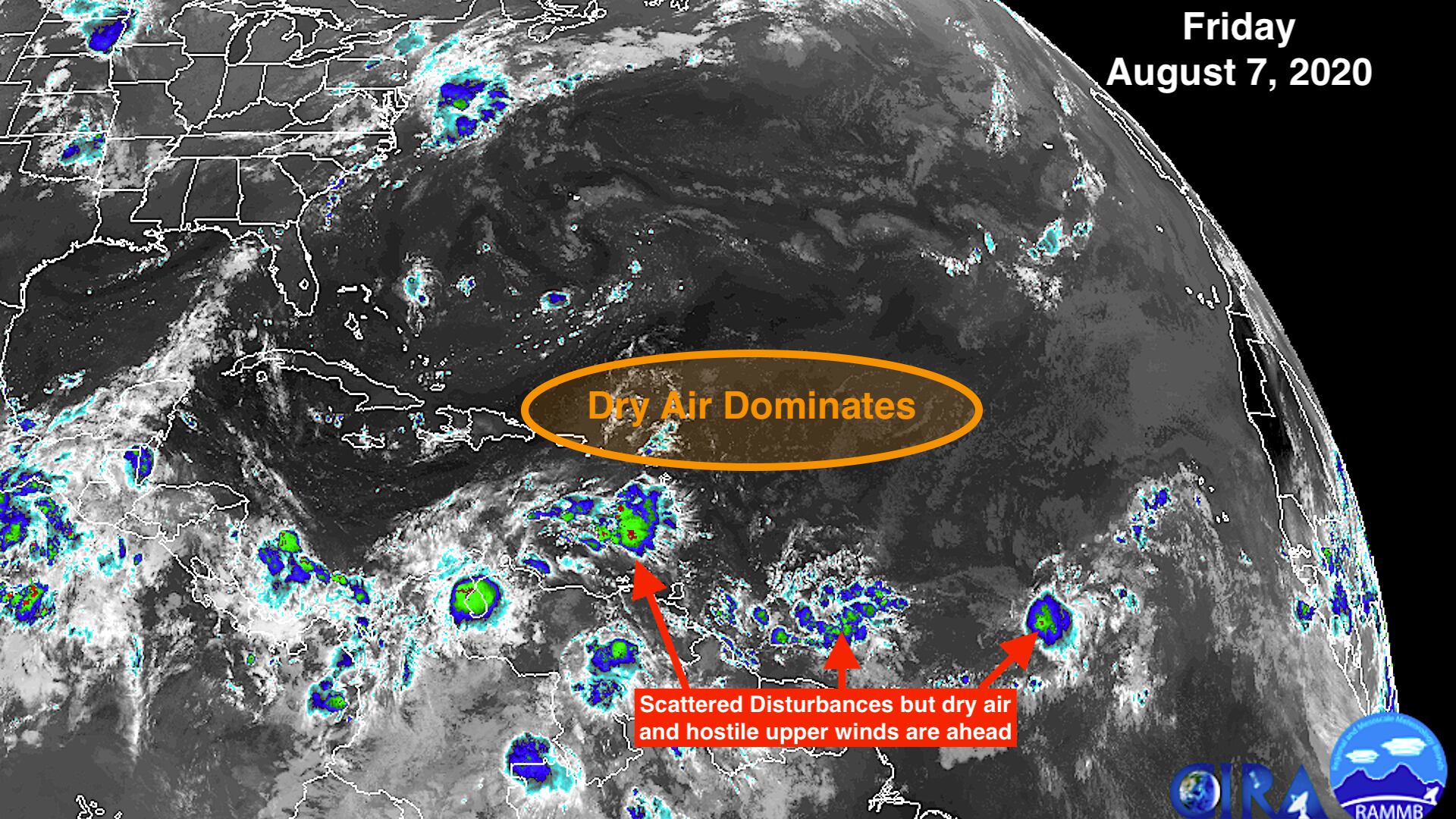 Thankfully, Mother Nature is currently taking a break. Dry air dominates the tropics, and there are hostile upper winds to boot. No tropical development is expected into the middle of next week.