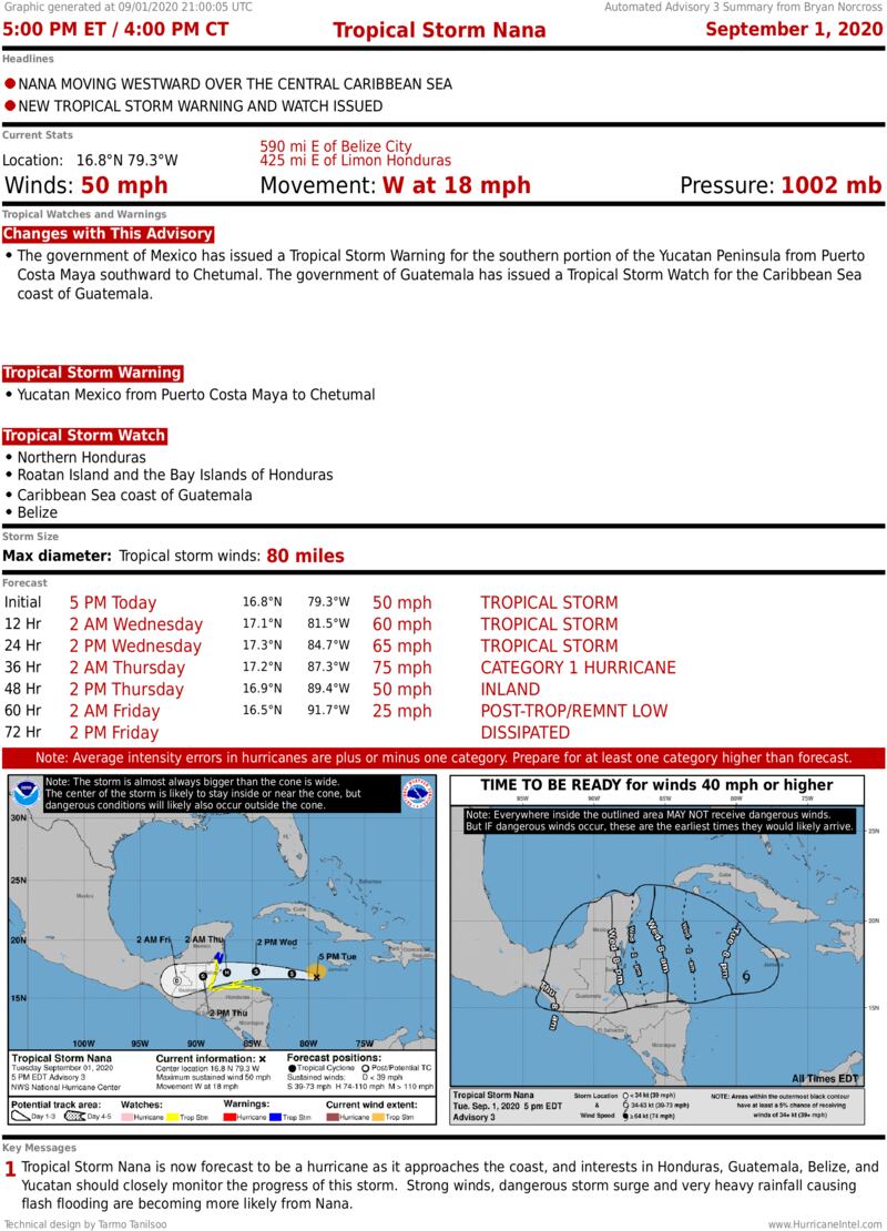 “On the forecast track, Nana will be moving near but north of the coast of Honduras on Wednesday and likely be approaching the coast of Belize on Thursday,” the Hurricane Center said in its 5 p.m. advisory. “Strengthening is forecast during the next 48 hours, and Nana could become a hurricane just prior to landfall on Thursday.”