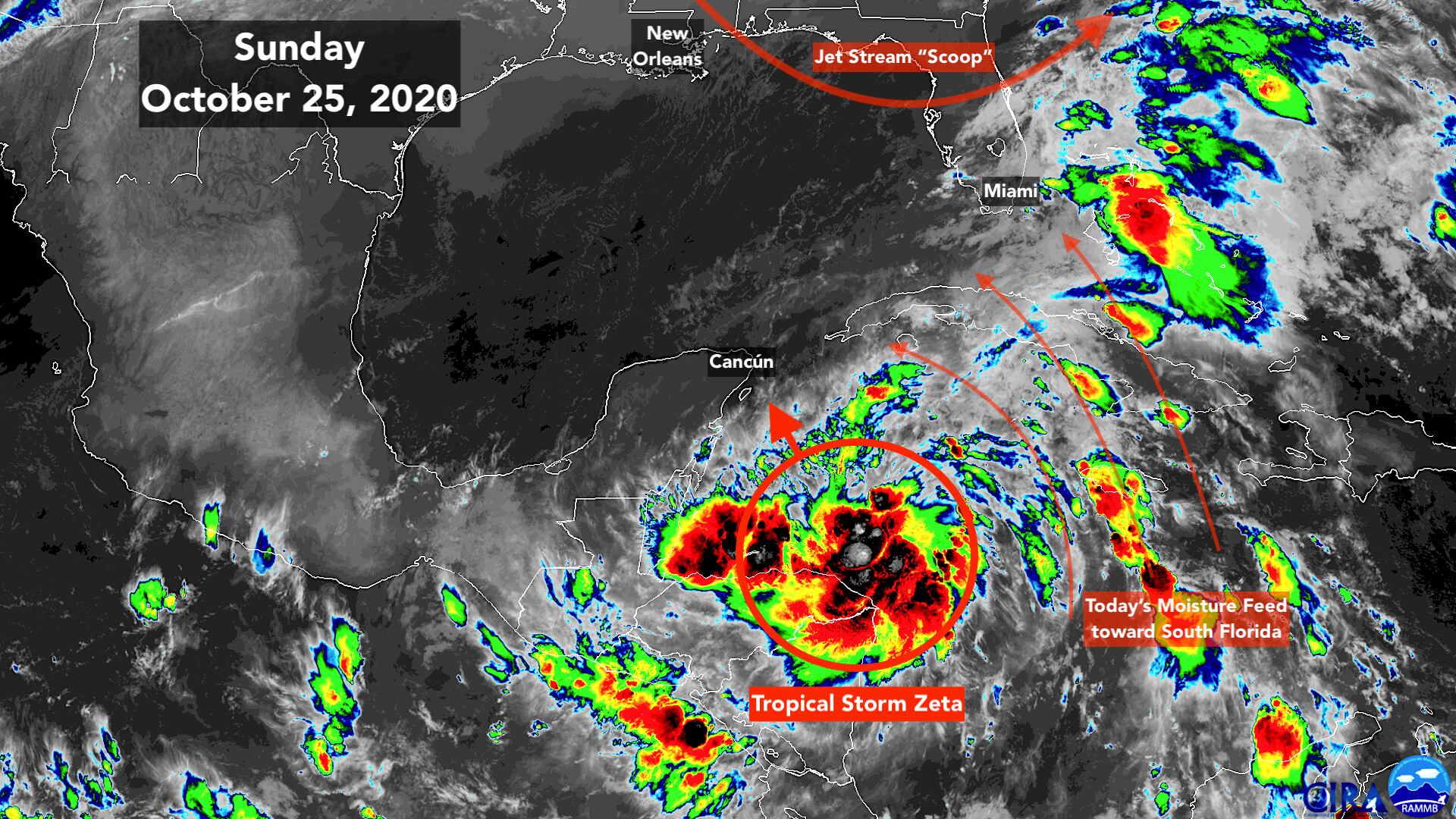 While Zeta is creeping northwest in the Caribbean today, a dip in the jet stream moving across the northern Gulf will scoop moisture north over the southern Florida peninsula.