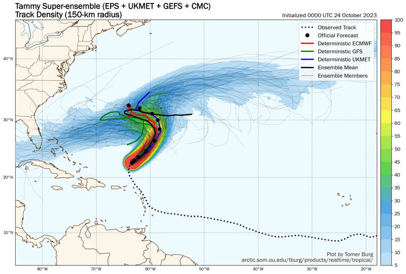 Forecast models continue to show a fork in the road for Tammy by mid-week, with some models flinging the storm system northeastward and out to sea while others insist a weaker system will bend westward or even southwestward into the weekend.