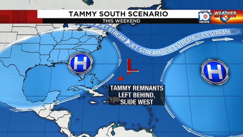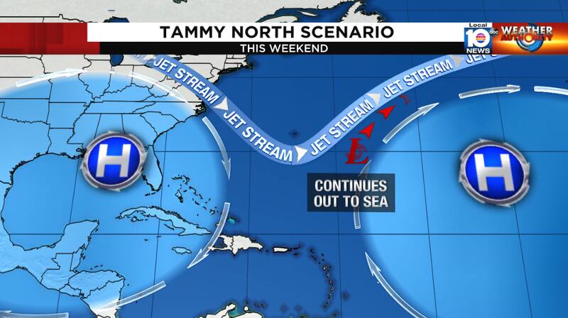 The big steering factor is a jet stream dip approaching from the west, which will help direct Tammy northward over the next few days. By late week, models are split on whether the jet stream flow will continue to guide Tammy out to sea or whether the jet stream will bypass the storm, which could trap it under high pressure steering to the west, diverting its course back to the west or even southwest.
