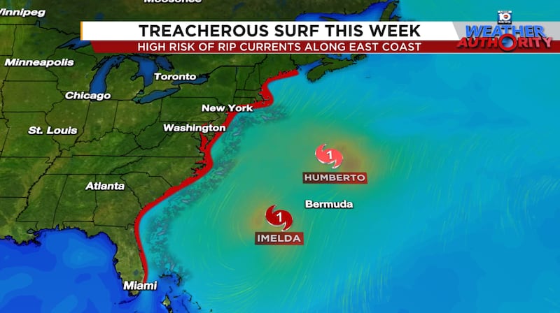 While Humberto isn’t any threat to land, it and Imelda will continue to bring dangerous surf across the western Atlantic and up and down the U.S. Eastern Seaboard this week, with a high risk of rip currents at least for the next several days.